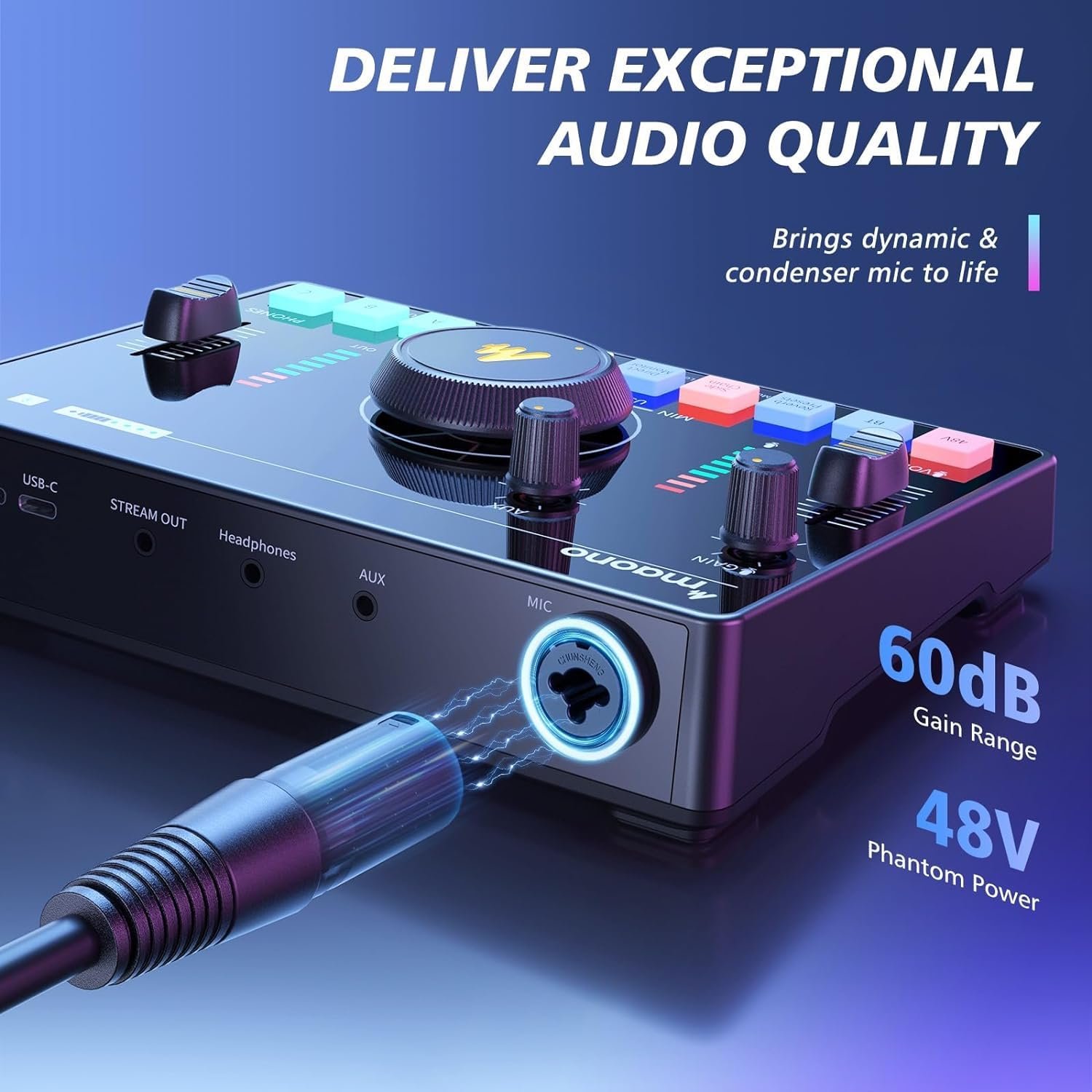 [EXCEPTIONAL AUDIO QUALITY]: The 48V phantom power drives XLR condenser mics, 2 levels of noise reduction, and a premium preamp with adjustable gain of up to 60dB delivers unmatched sound quality