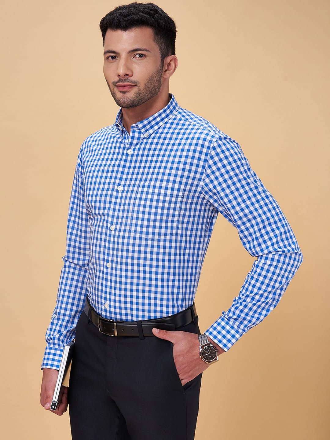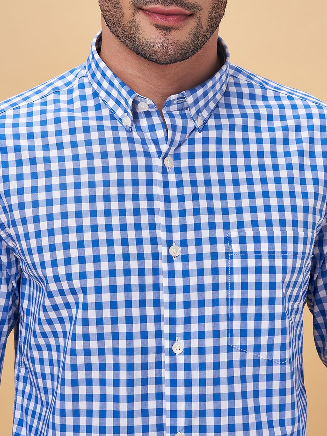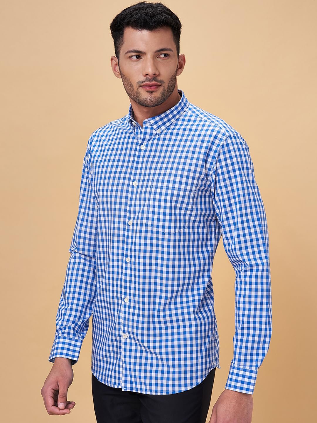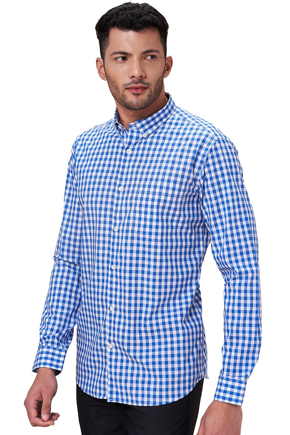 Let this shirt be the star of all the shirts in your closet. The design details are a button-down collar, a front opening, cuffed full sleeves, a chest pocket and a distinct check pattern. Constructed using top-notch woven fabric to deliver enhanced comfort along with style.