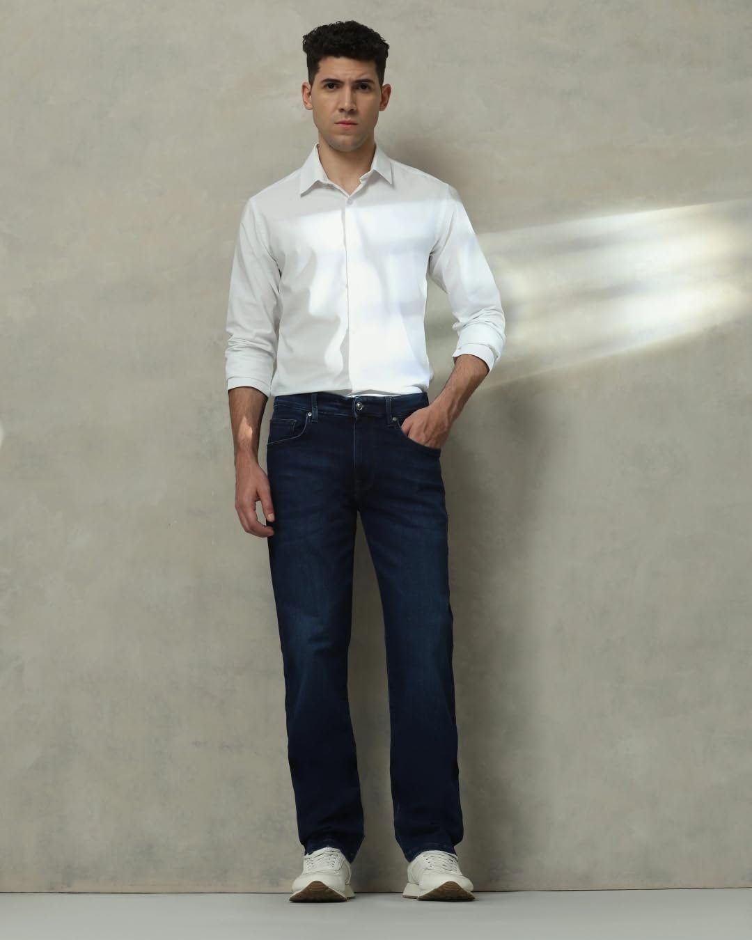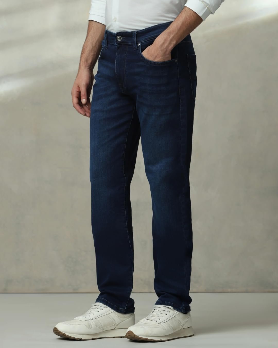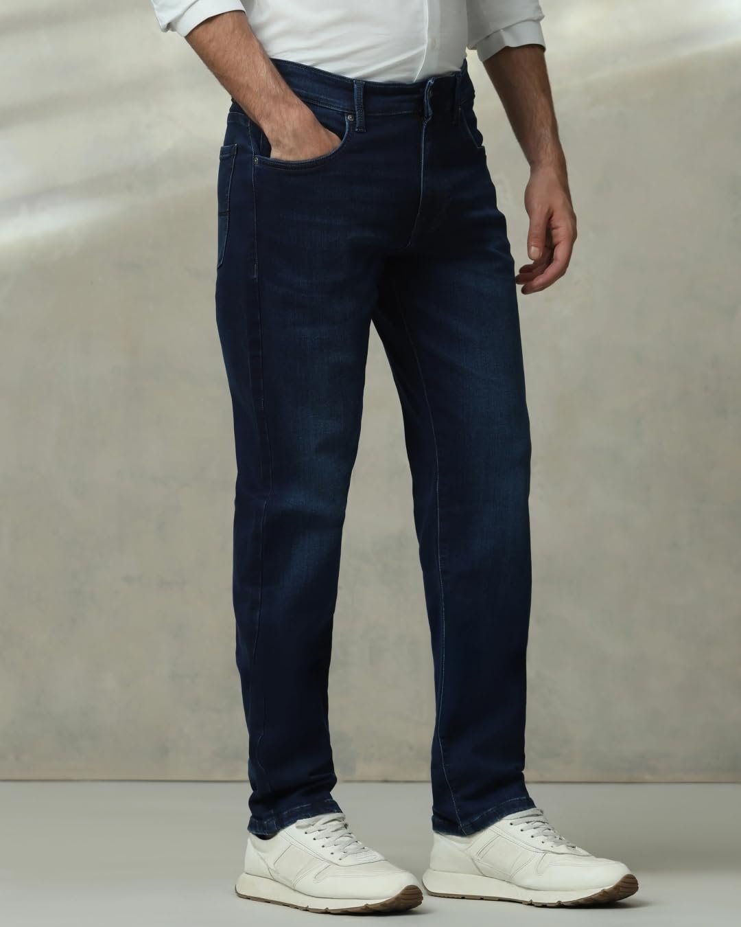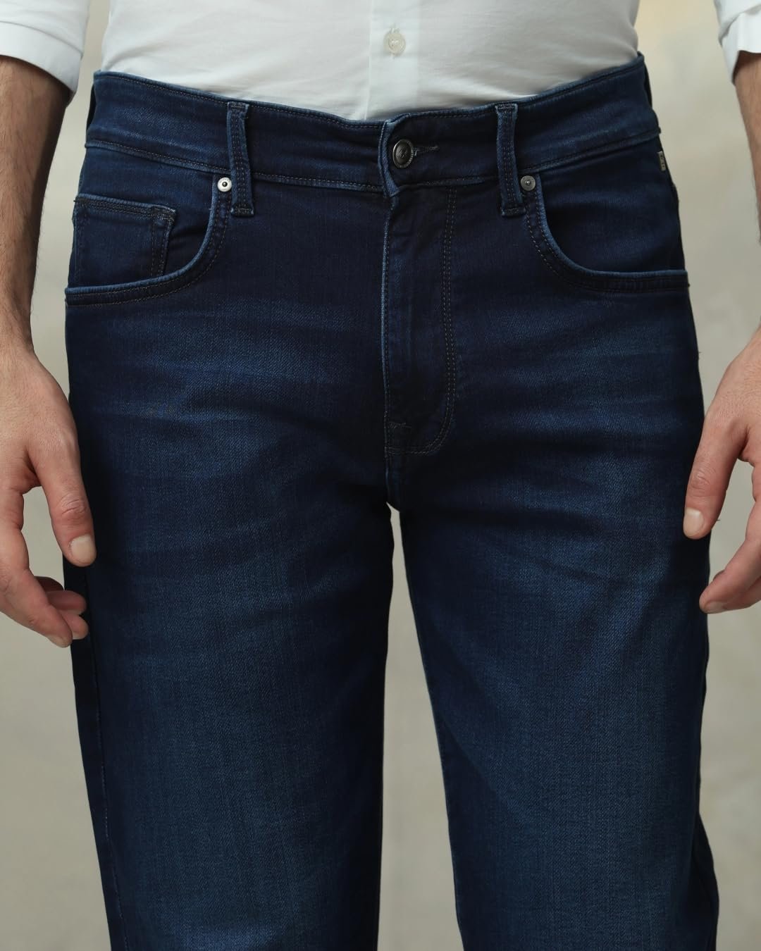 These indigo jeans for men offer classic style and comfort for casual wear. Made from a cotton-lycra blend, they feature a mid-rise waist and regular fit. The solid pattern and button-and-zip closure ensure a timeless look. Ideal for basic casual activities, these versatile jeans pair well with various tops, making them a wardrobe essential for the modern man seeking both style and practicality.