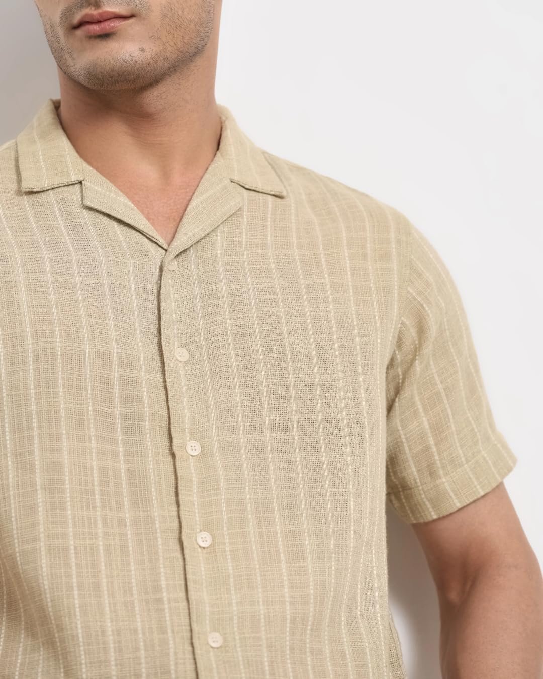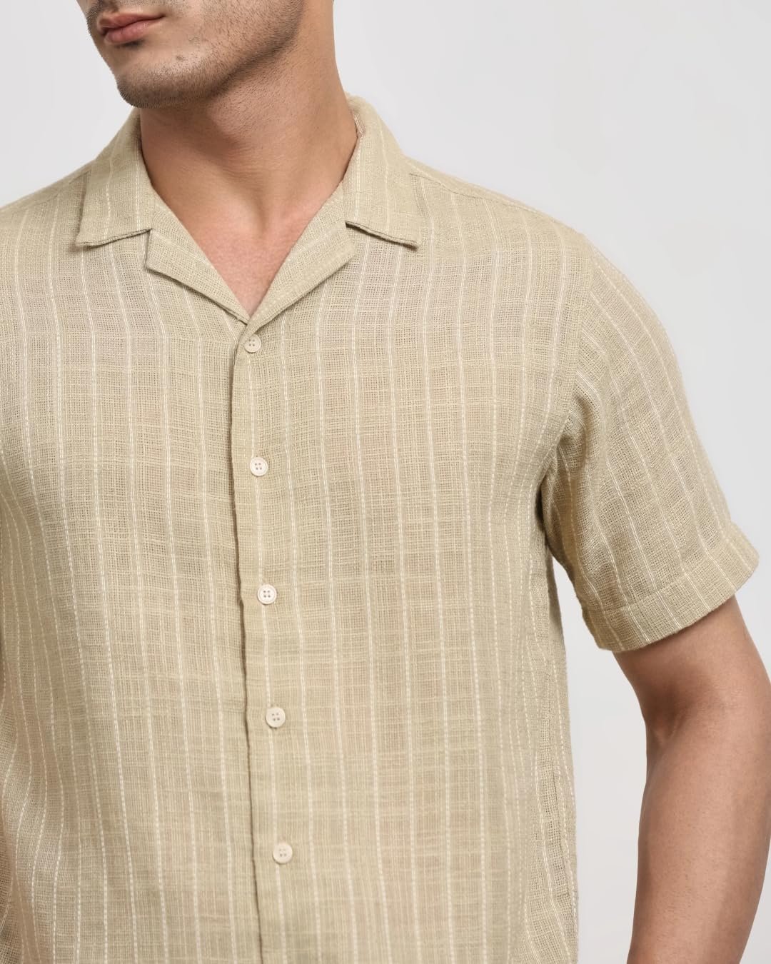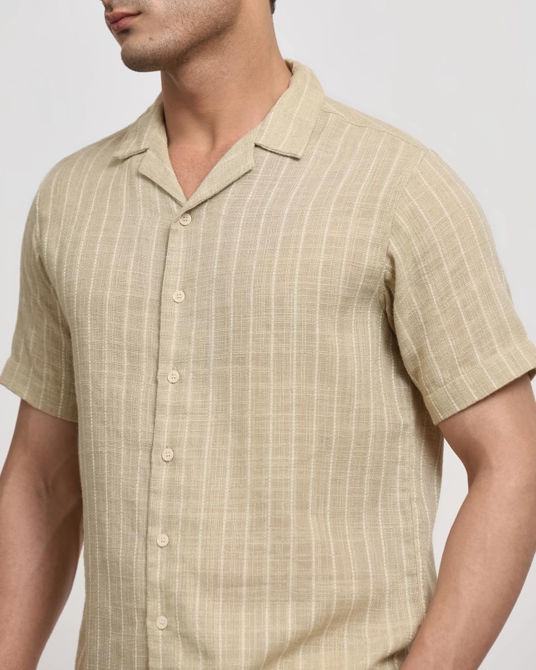 Elevate your casual style with this light green, relaxed-fit shirt featuring vertical stripes. The half-sleeve design and camp collar offer a laid-back vibe, perfect for basic casual wear. Crafted from a comfortable poly-blend material, this men’s shirt boasts a button closure for easy wear. Its versatile design makes it suitable for various casual occasions.