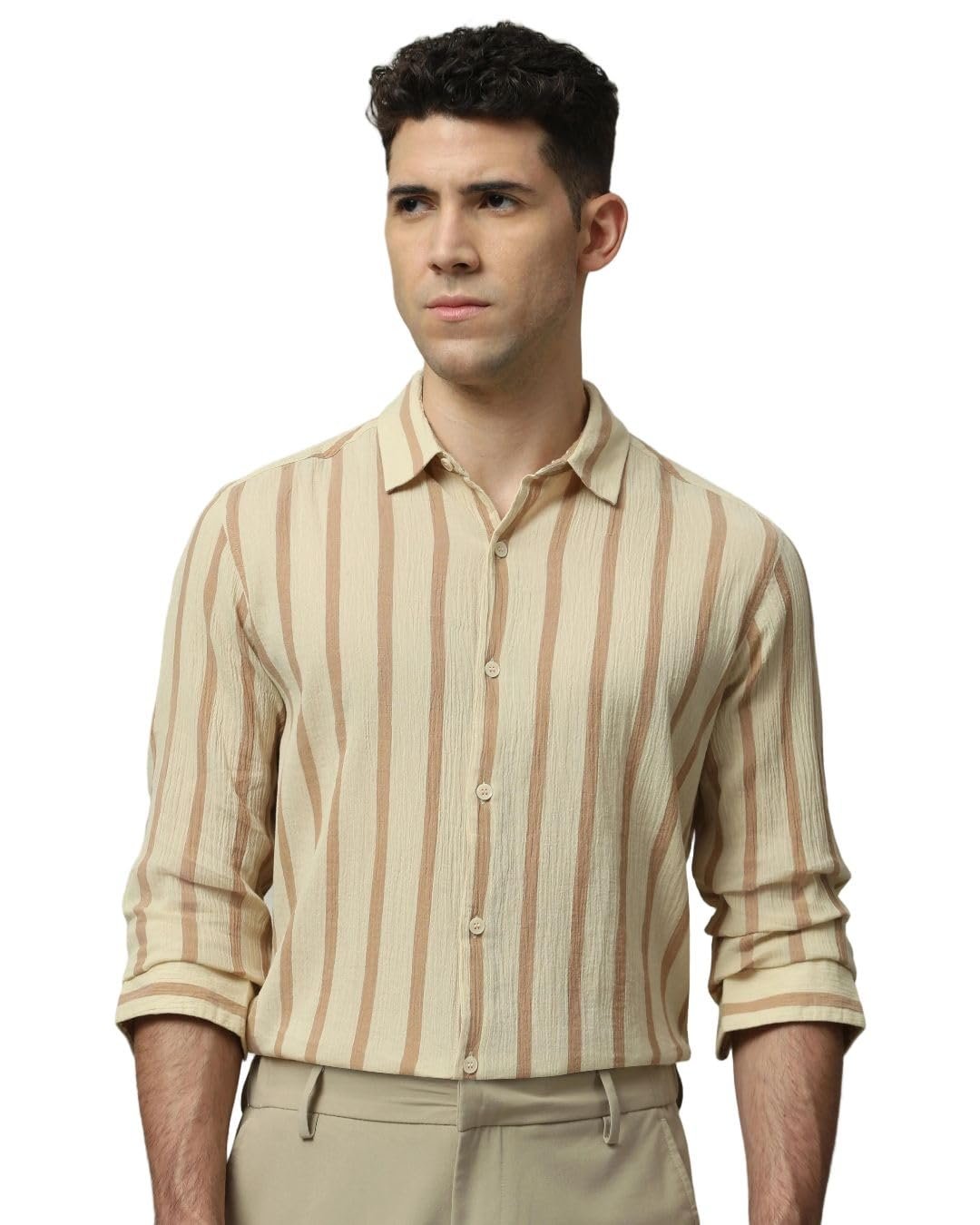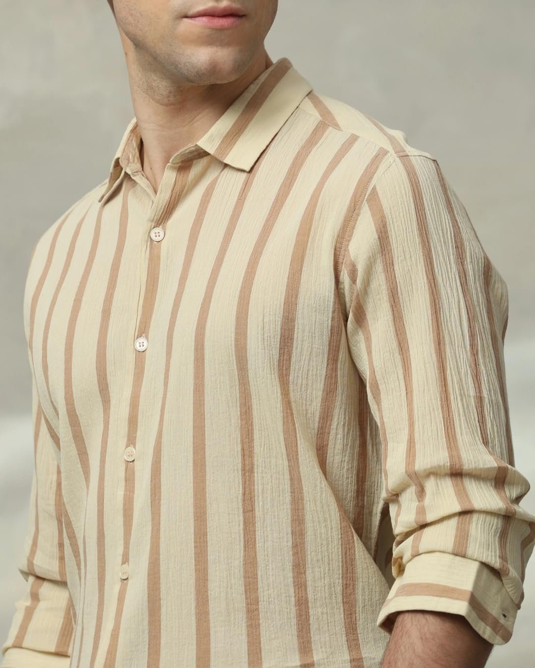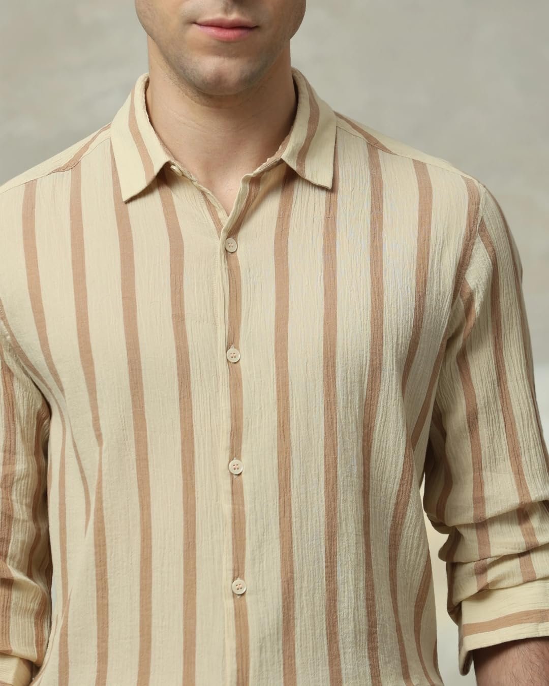Make a statement with this sage slim-fit shirt for men. The vertical stripe pattern adds a modern touch to your casual look. Crafted from pure cotton, it offers ultimate comfort and breathability. The full sleeves and spread neckline exude sophistication. The button closure ensures a secure fit, making it perfect for various basic casual occasions.