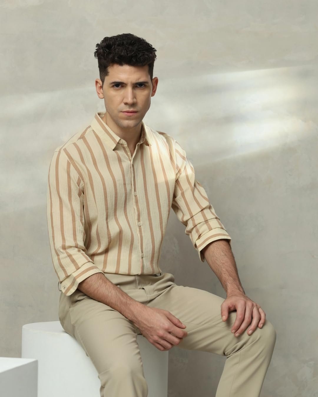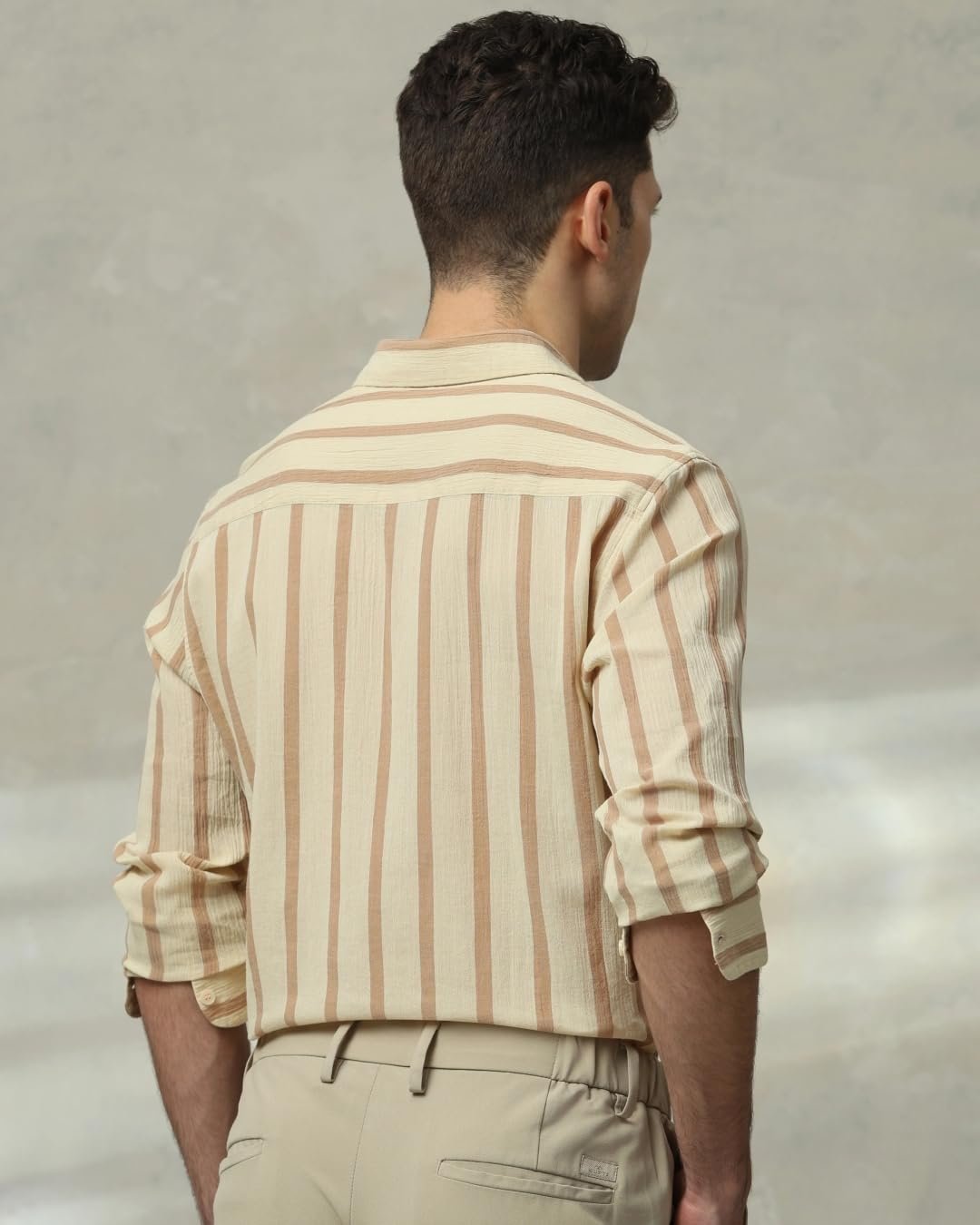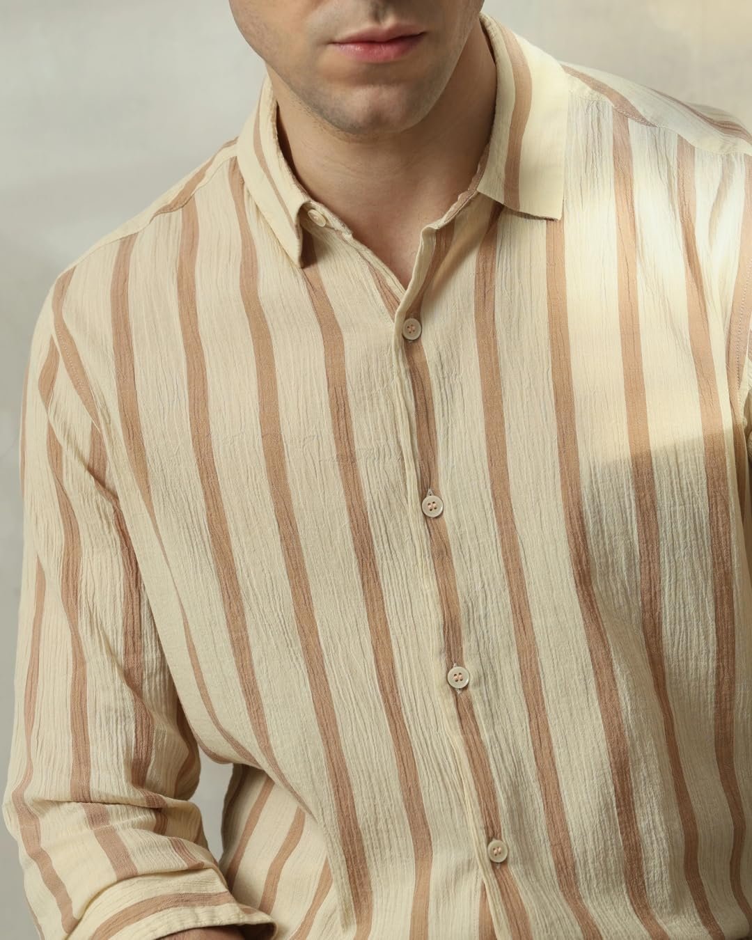 Make a statement with this sage slim-fit shirt for men. The vertical stripe pattern adds a modern touch to your casual look. Crafted from pure cotton, it offers ultimate comfort and breathability. The full sleeves and spread neckline exude sophistication. The button closure ensures a secure fit, making it perfect for various basic casual occasions.