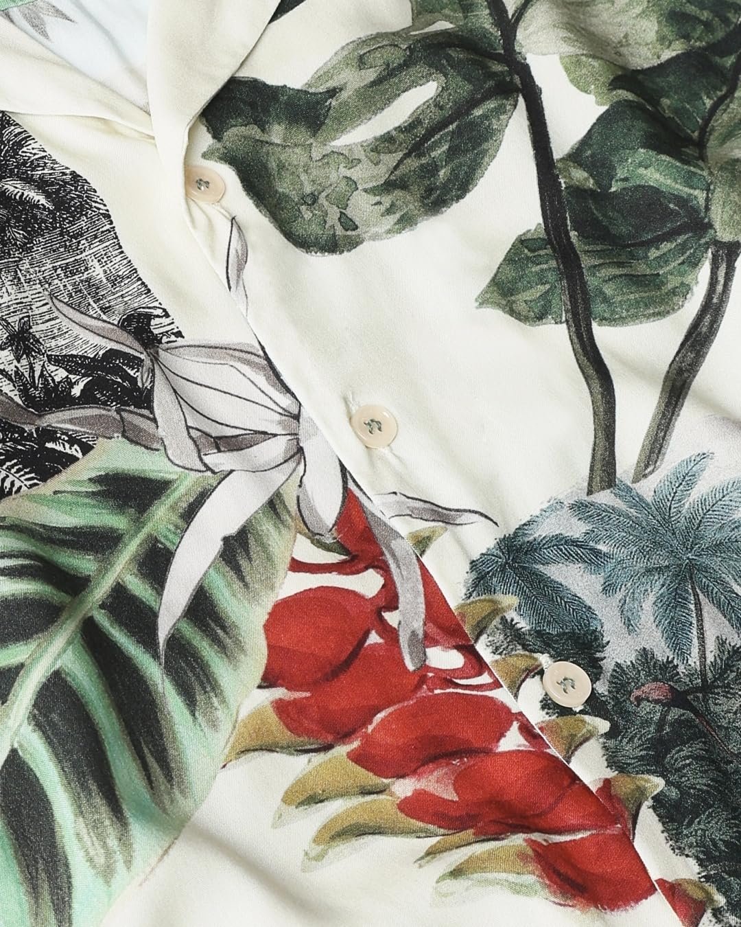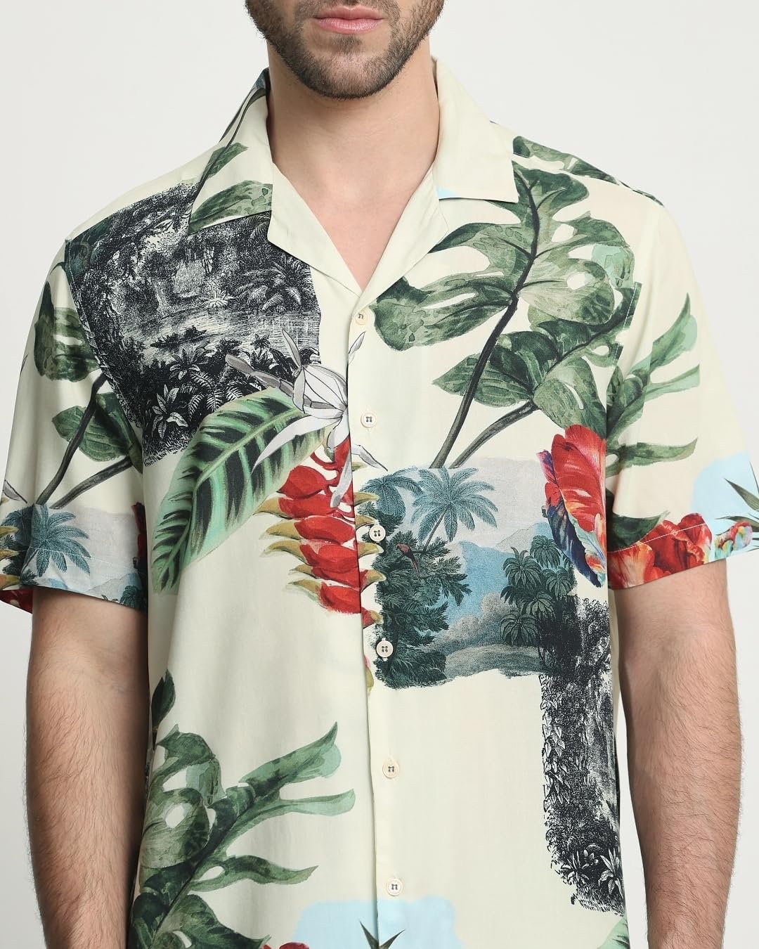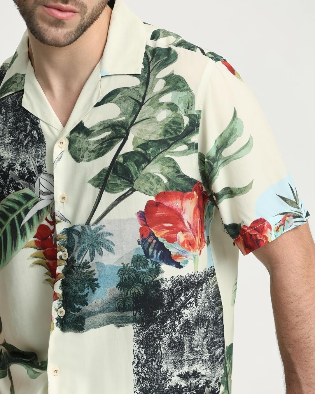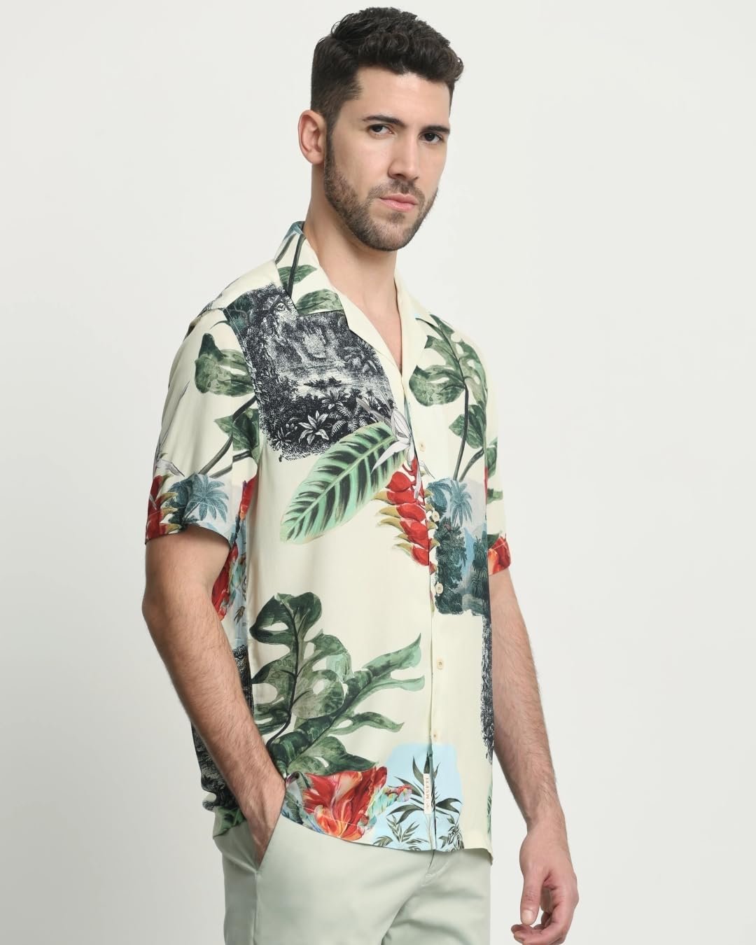 Embrace tropical vibes with this relaxed-fit camp shirt. The vibrant olive color and tropical pattern create a lively summer look. Made from lightweight viscose, it’s perfect for warm weather. The camp neckline and half sleeves add to its casual charm, making it ideal for beach outings or casual gatherings. The relaxed fit ensures comfort without compromising on style. Pair it with shorts or linen pants for a complete vacation-ready ensemble that’s sure to turn heads.