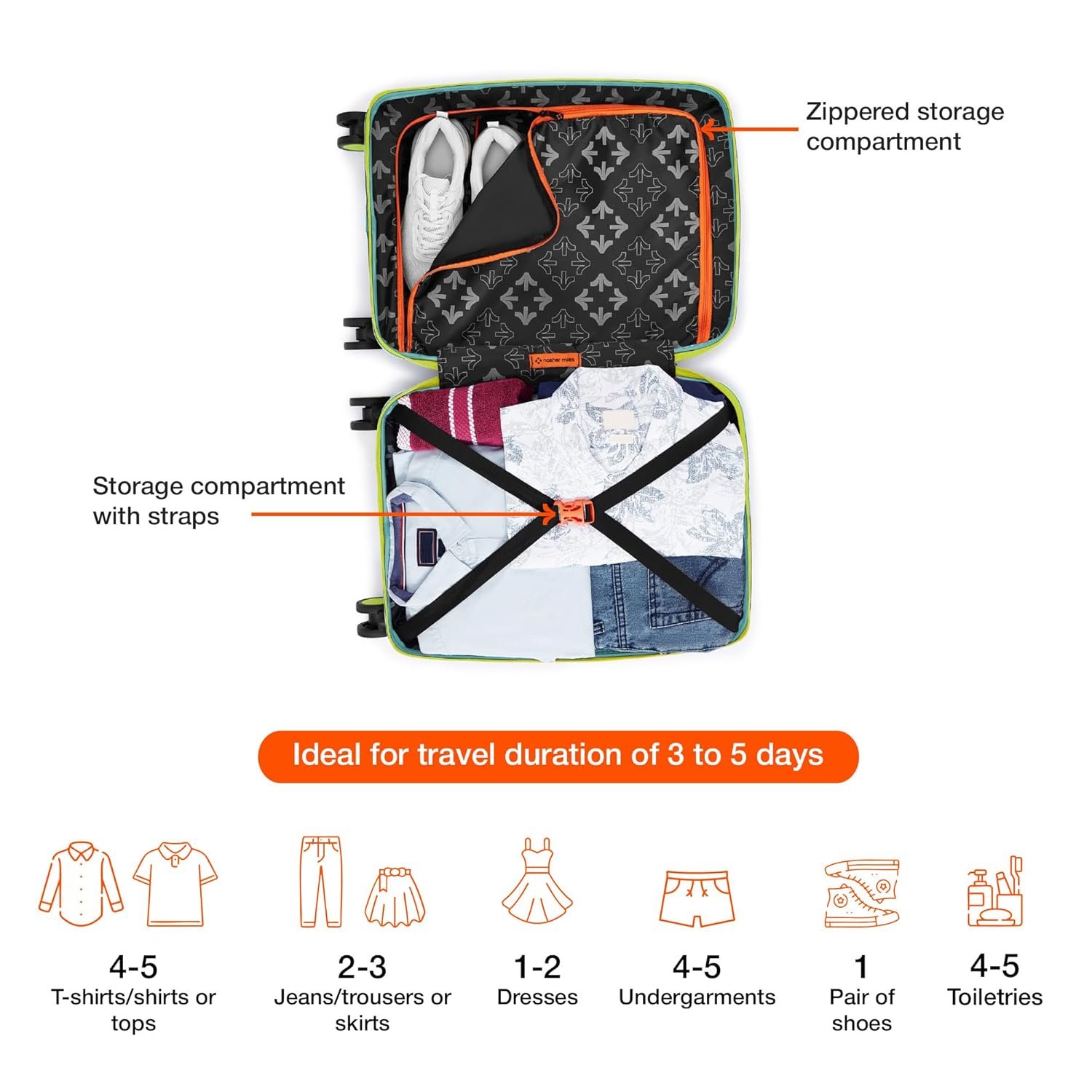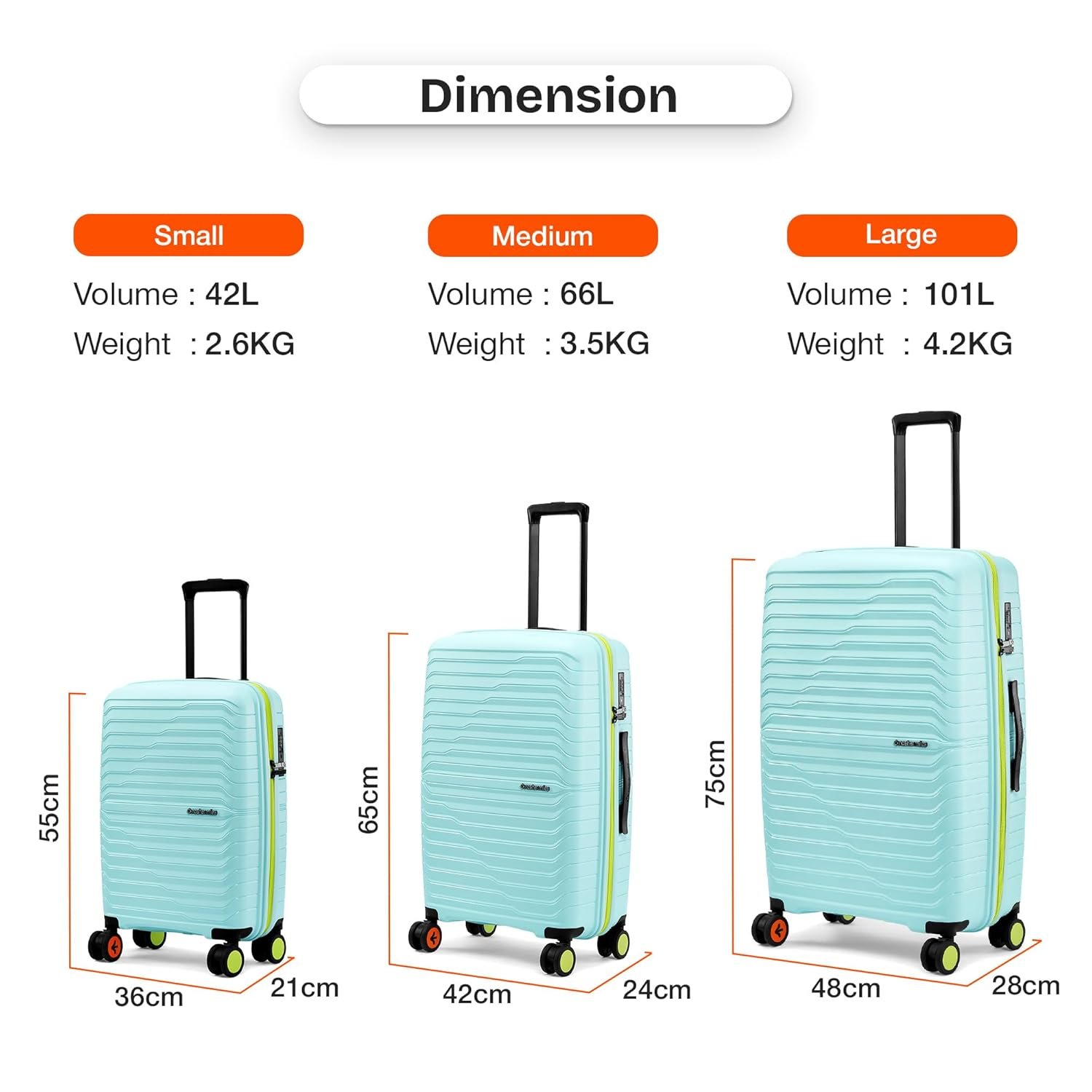 Carry-On Small (S): With a compact 20-inch size, this carry-on suitcase is ideal for travel duration ranging from 1 to 5 days, making it the perfect companion for weekend getaways, business trips, or quick vacations. Suitcase can hold weight up to 8 Kg.