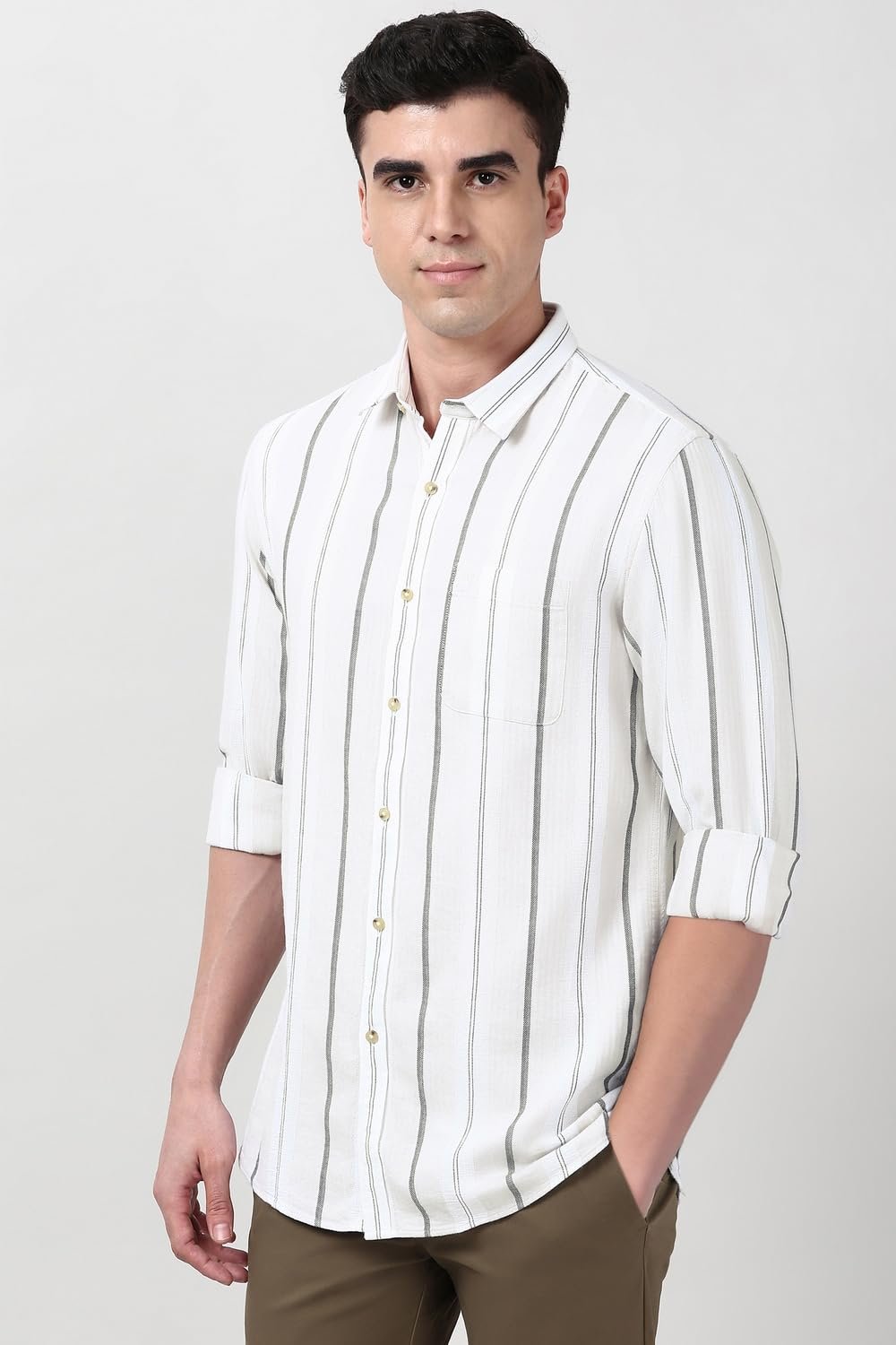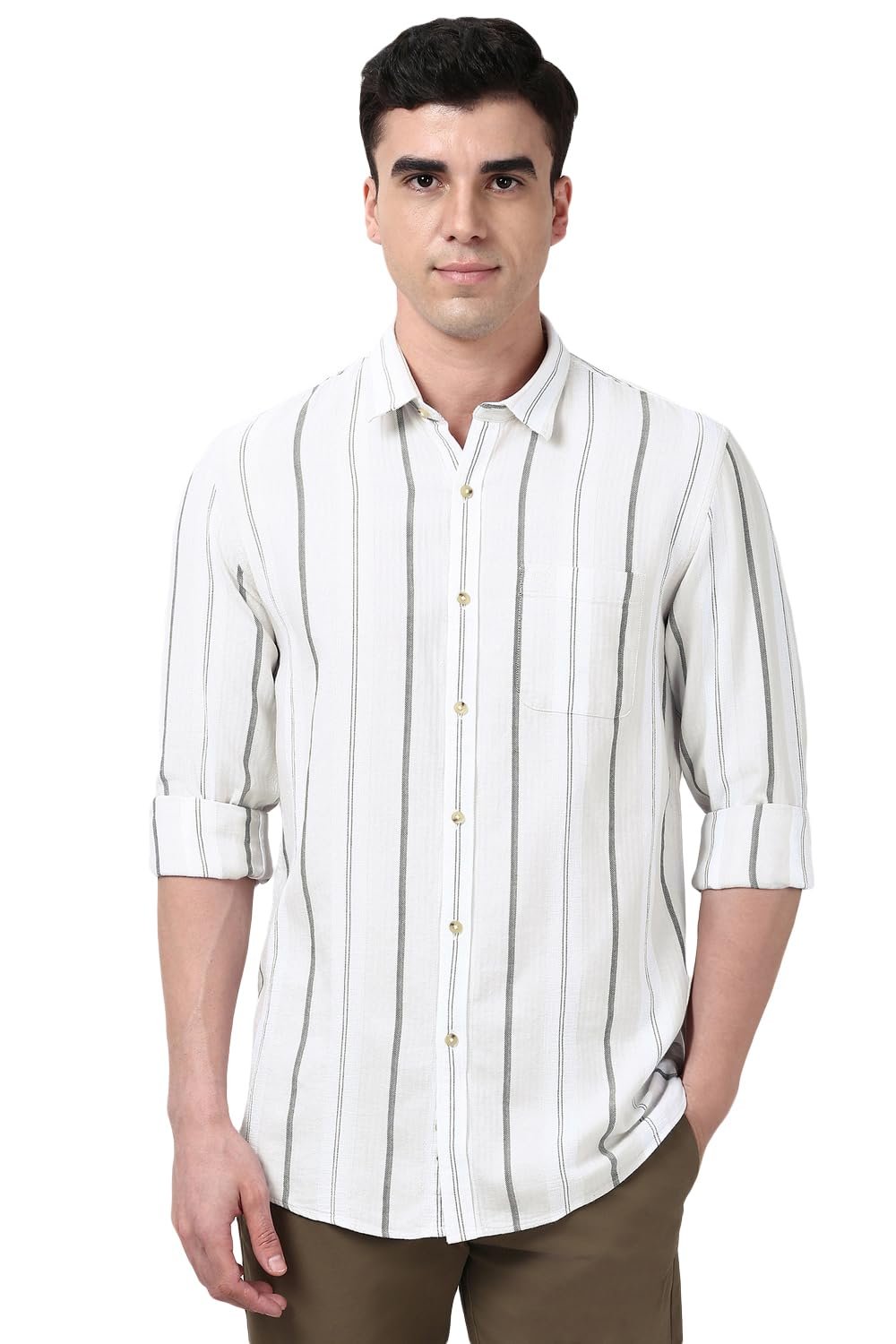 Peter England’s Cotton Linen Blend Shirt for Men – Full Sleeves, Subtle Stripes