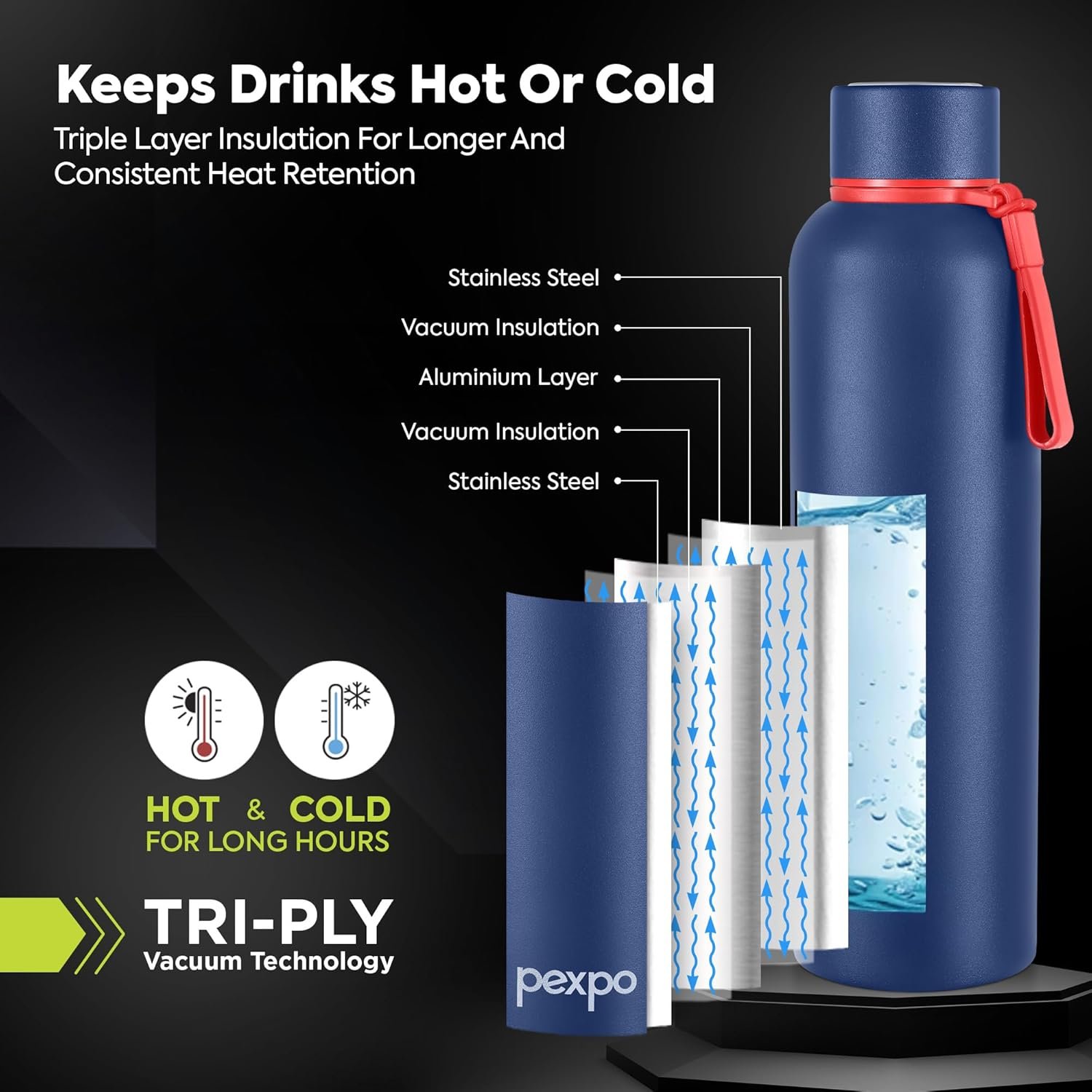 ADVANCED TRI-PLY VACUUM TECHNOLOGY: Unlike Double Wall, this water bottle comes with three layers of insulation, which keeps your beverages hot or cold for hours which keeps the retention of temperature same for a longer duration