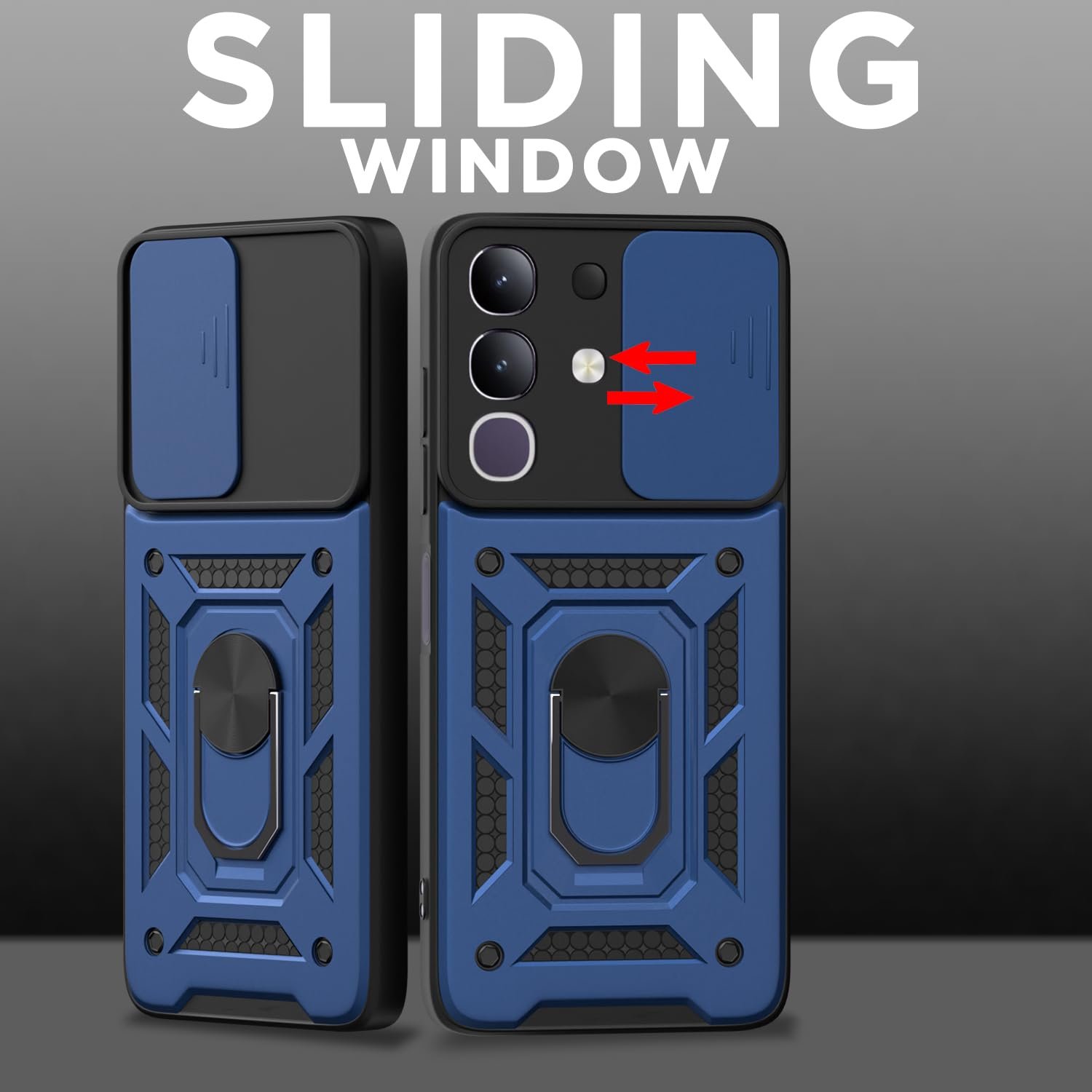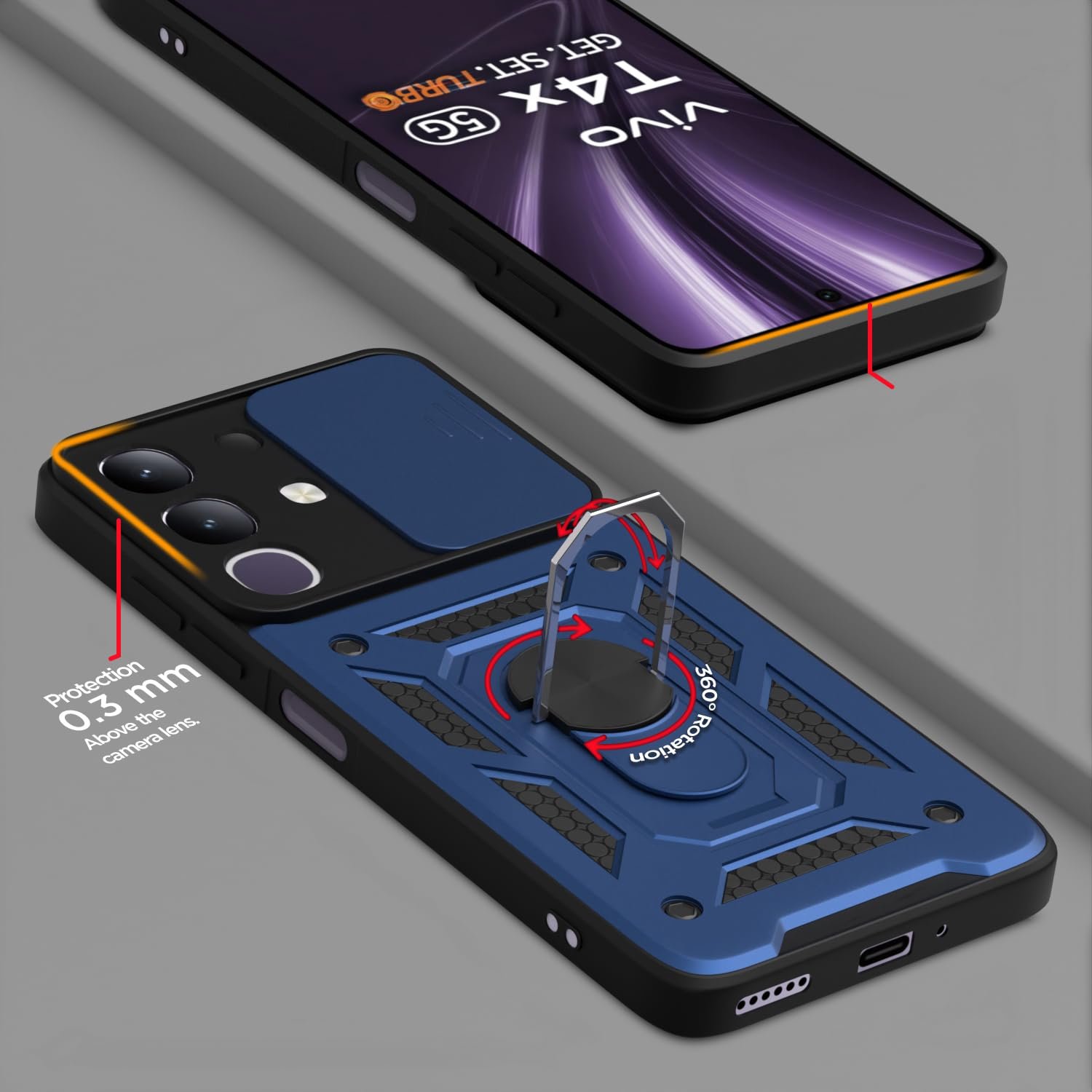 Pikkme Back Cover for Vivo T4x 5G / iQoo Z10x 5G / Vivo Y31 Pro 5G | 360 Protection Case | Sliding Camera Shield Cover & Ring Holder Stand D10 Tough Armor Bumper Case (Blue)