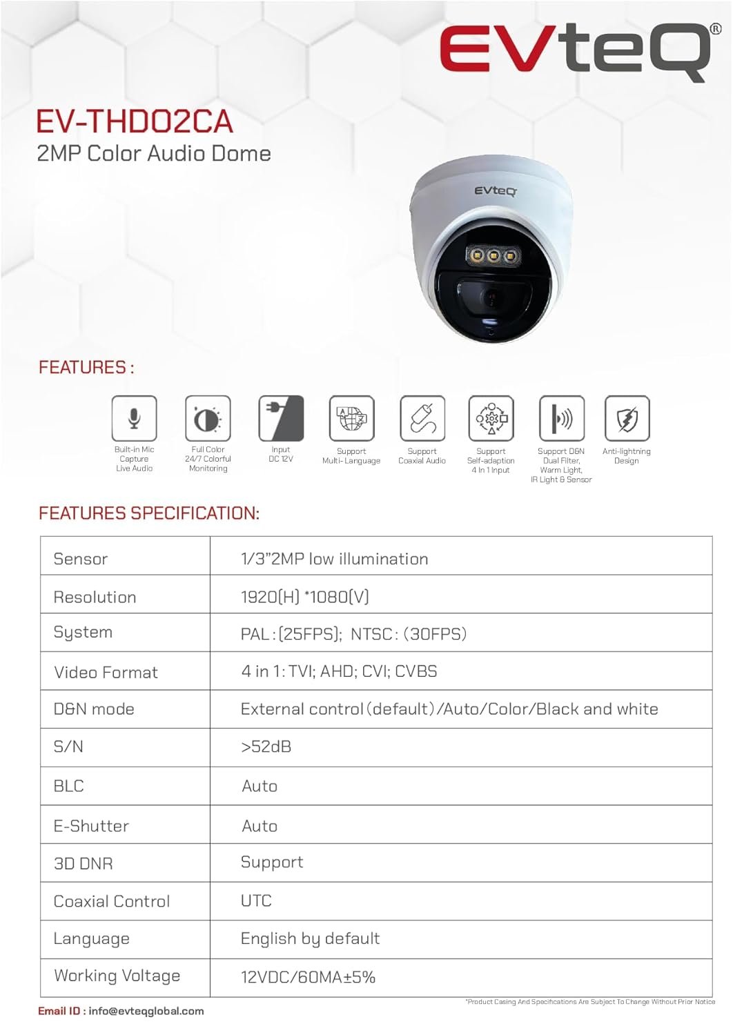 (Refurbished) EVteQ 2MP Color Audio Dome Camera Designed for Both Indoor and Outdoor Surveillance Camera EV-THDO2CA