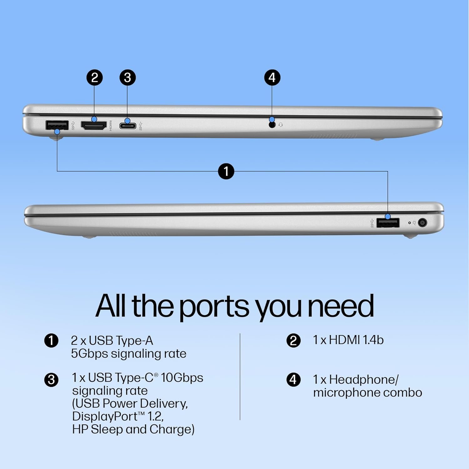 Ports & Connectivity :2 USB Type-A 5Gbps signaling rate; 1 AC smart pin; 1 HDMI 1.4b; 1 headphone/microphone combo; 1 USB Type-C 10Gbps signaling rate (USB Power Delivery, DisplayPort 1.2, HP Sleep and Charge)| Connectivity: Realtek Wi-Fi 6 (2×2) and Bluetooth 5.3 wireless card (supporting gigabit data rate)