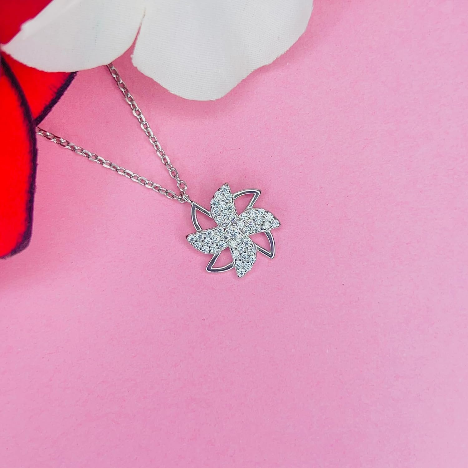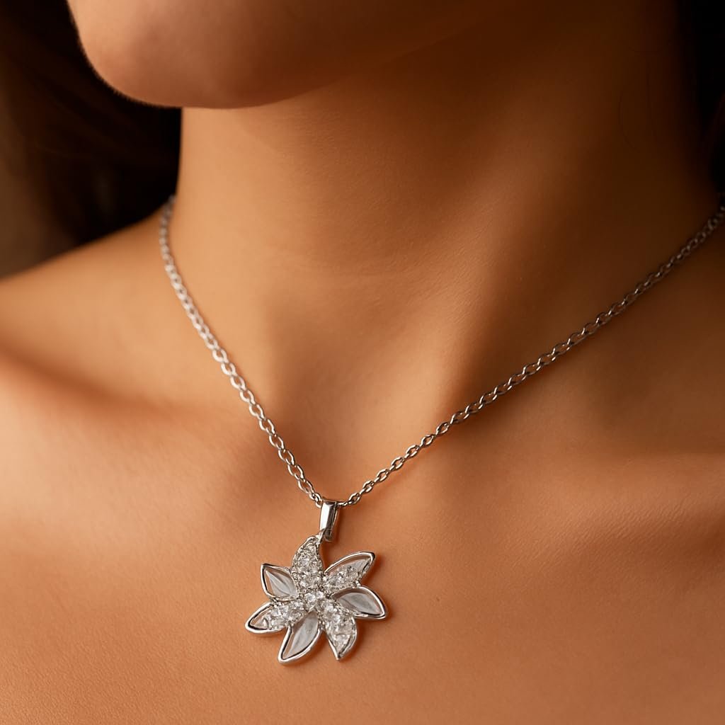 Rukmi Silver FloraGlow Pendant: Elegant Chain Necklace for Women & Girls – Stylish Fashion Jewellery, Delicate Floral Design, Perfect Gift