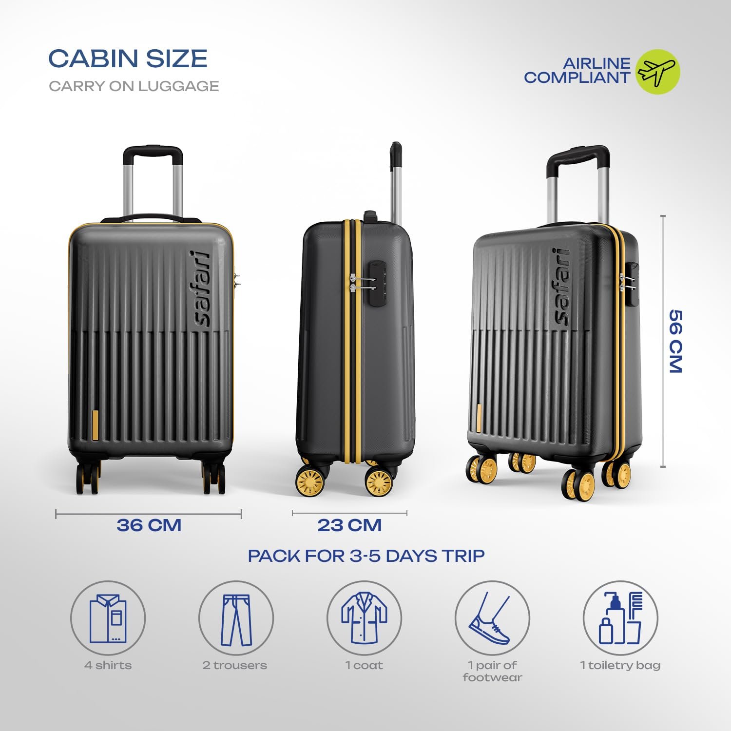 Carry on Luggage: The cabin size trolley bag meets airline approved carry-on dimensions, ensuring a hassle-free travel experience.