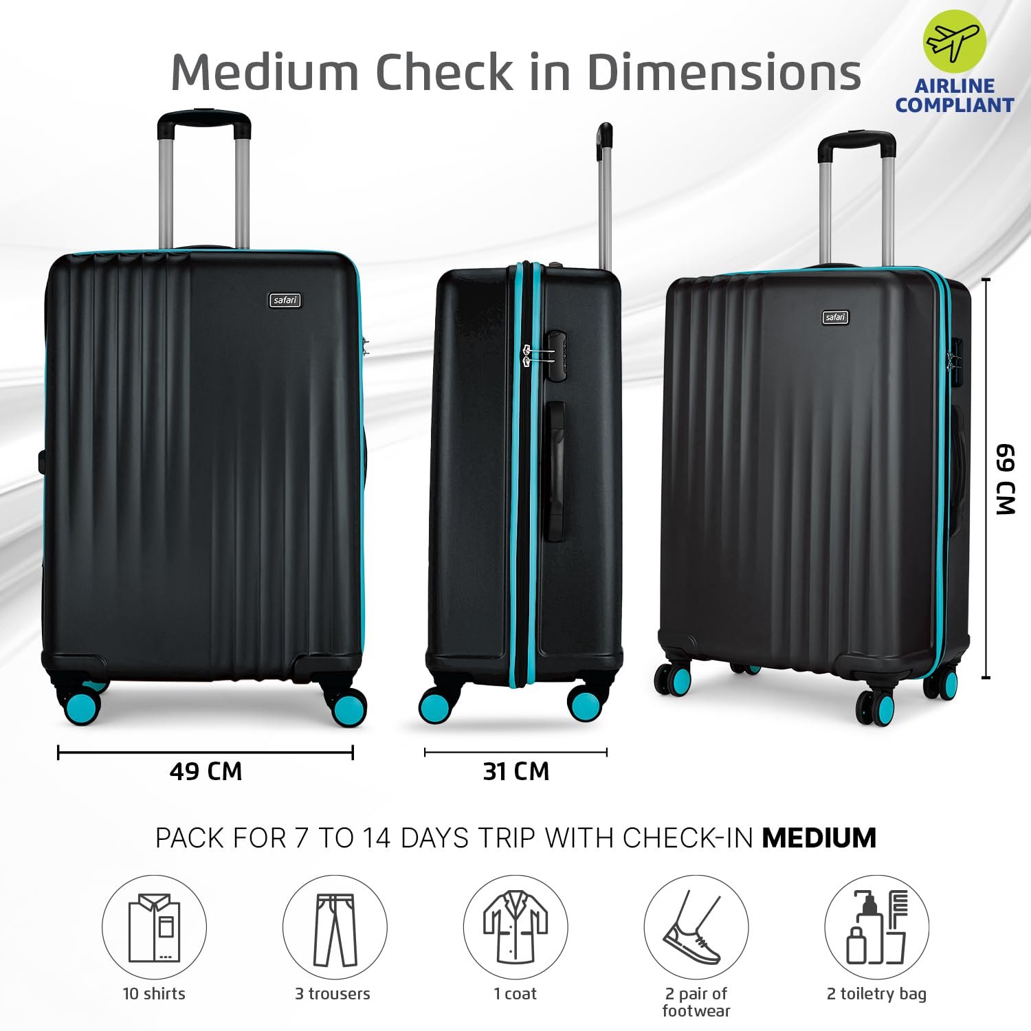 Safari Citymiles 8 Wheels 69 Cm Medium Size Trolley Bag Hard Case Polycarbonate 360 Degree Wheeling Check in Luggage, Antitheft Zipper, Travel Bag, Suitcase for Travel, Trolley Bags for Travel, Black