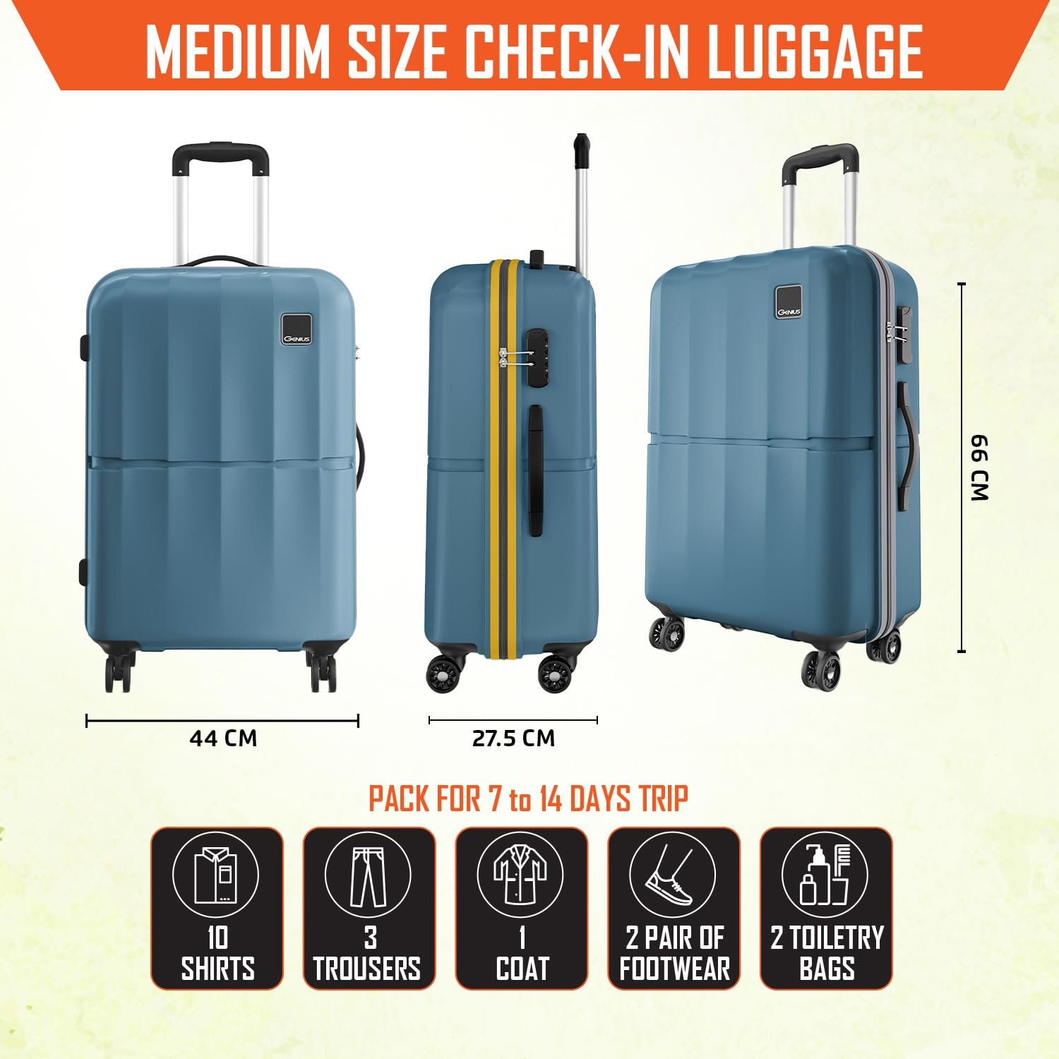 Check-in Luggage: The Medium size check-in trolley bag meets airline travel standards, ensuring a smooth check-in experience.