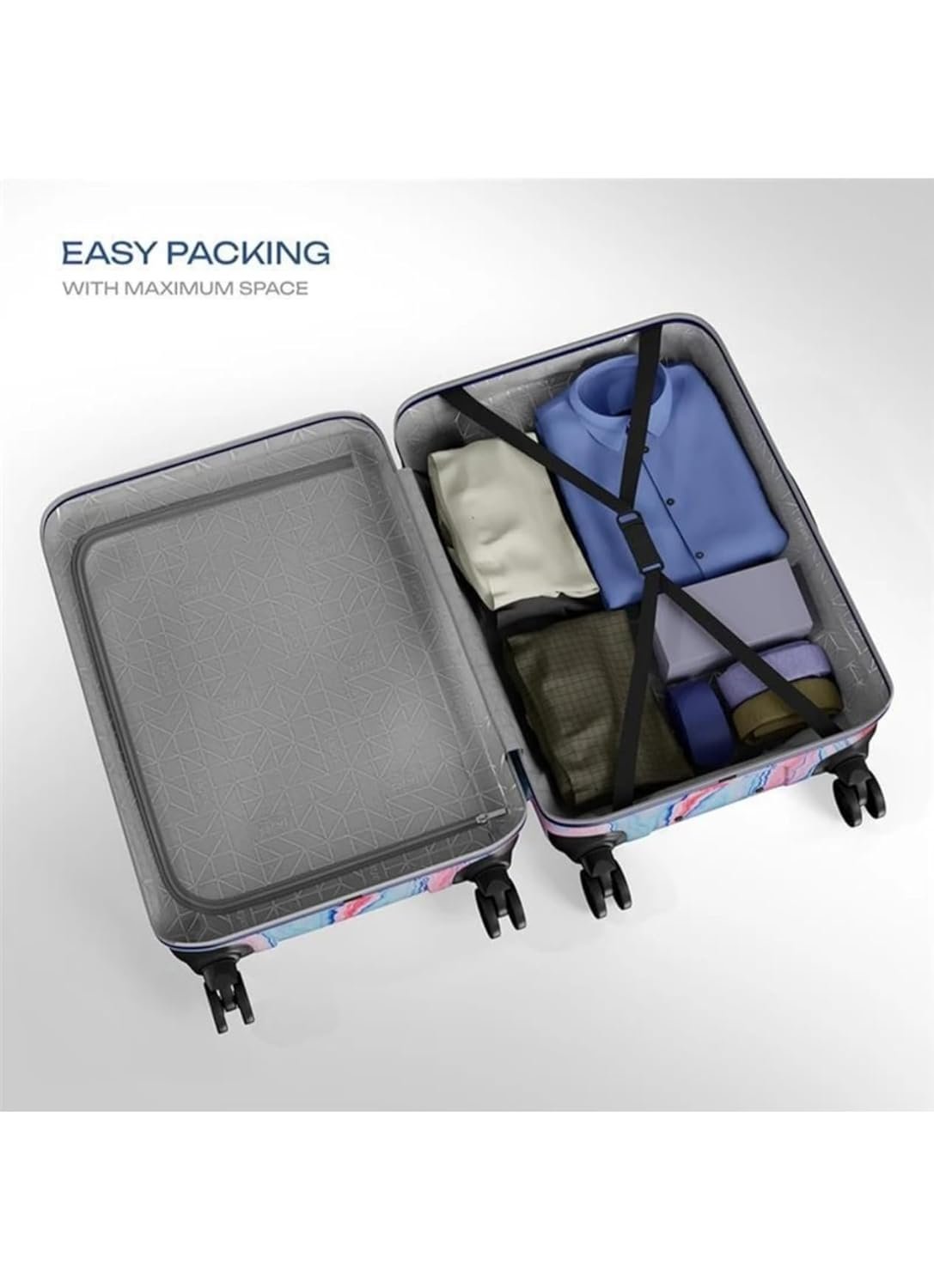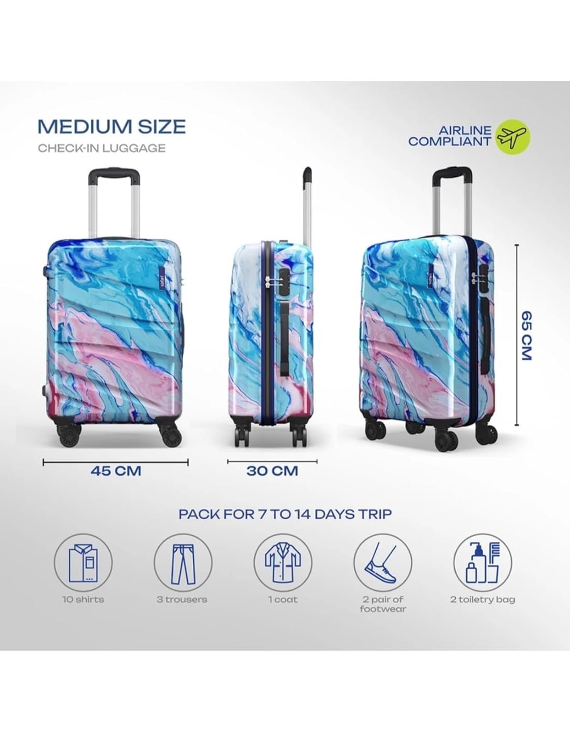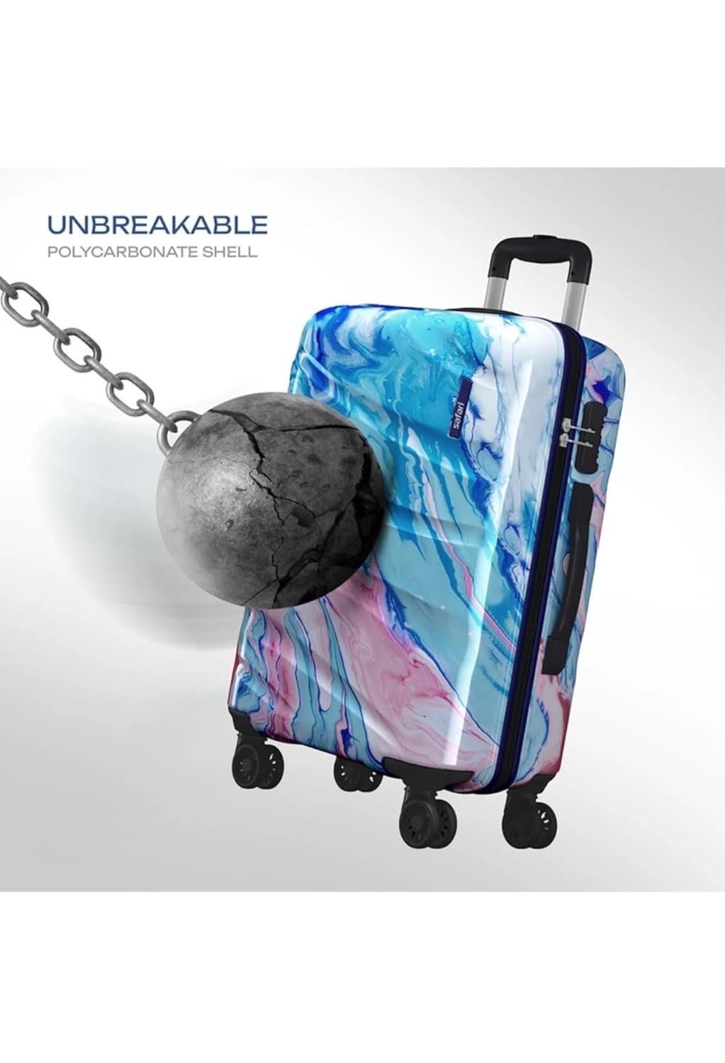 Travel in style with this stunning set of two trolley bags featuring a mesmerising marble-like pattern in soothing blue and pink hues. These airline-compliant bags come with smooth-rolling wheels and telescopic handles for effortless mobility. Each bag has undergone rigorous quality testing including drop, jolt, tumble, conveyor, toppling, and zipper tests, ensuring durability during your travels. The spacious interior can accommodate 10 shirts, 3 trousers, 1 coat, 2 pairs of footwear, and 2 toiletry bags. Backed by a 3-year international warranty valid in over 120 countries, these trolley bags combine functionality with contemporary aesthetics. The hard-shell exterior not only protects your belongings but also makes a striking visual statement with its unique watercolour-inspired design.