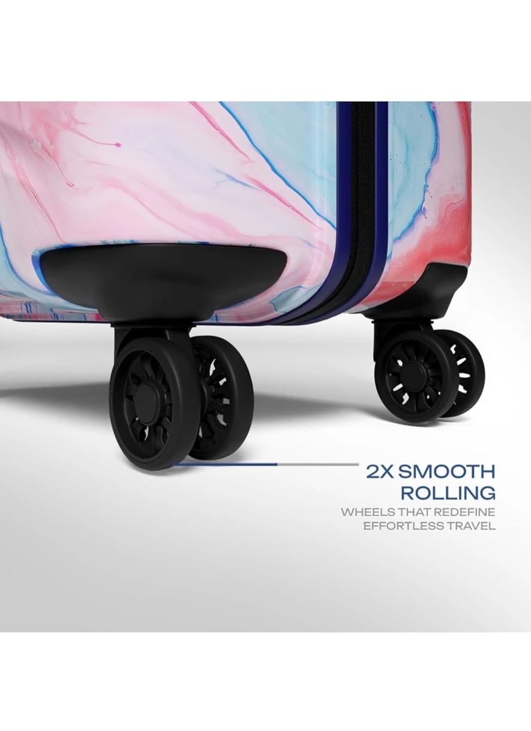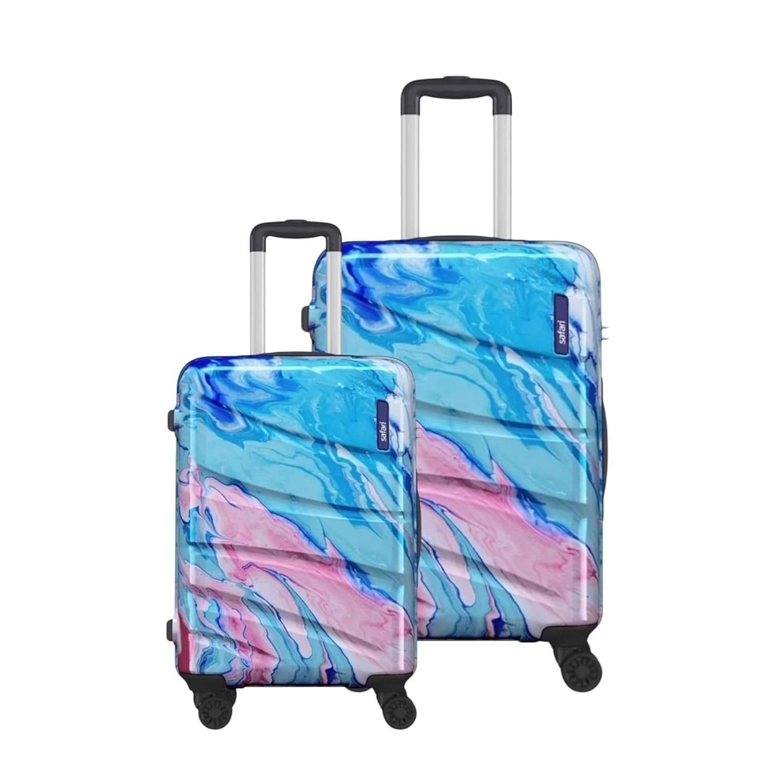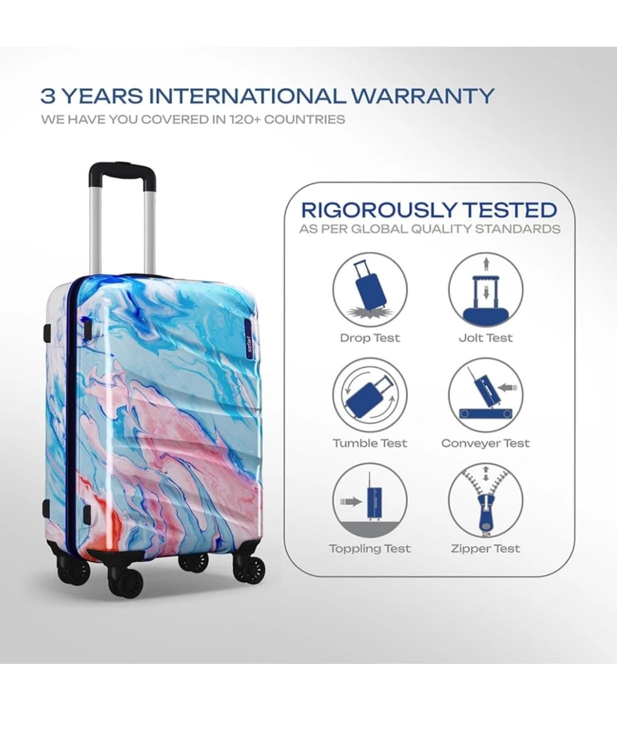 Travel in style with this stunning set of two trolley bags featuring a mesmerising marble-like pattern in soothing blue and pink hues. These airline-compliant bags come with smooth-rolling wheels and telescopic handles for effortless mobility. Each bag has undergone rigorous quality testing including drop, jolt, tumble, conveyor, toppling, and zipper tests, ensuring durability during your travels. The spacious interior can accommodate 10 shirts, 3 trousers, 1 coat, 2 pairs of footwear, and 2 toiletry bags. Backed by a 3-year international warranty valid in over 120 countries, these trolley bags combine functionality with contemporary aesthetics. The hard-shell exterior not only protects your belongings but also makes a striking visual statement with its unique watercolour-inspired design.