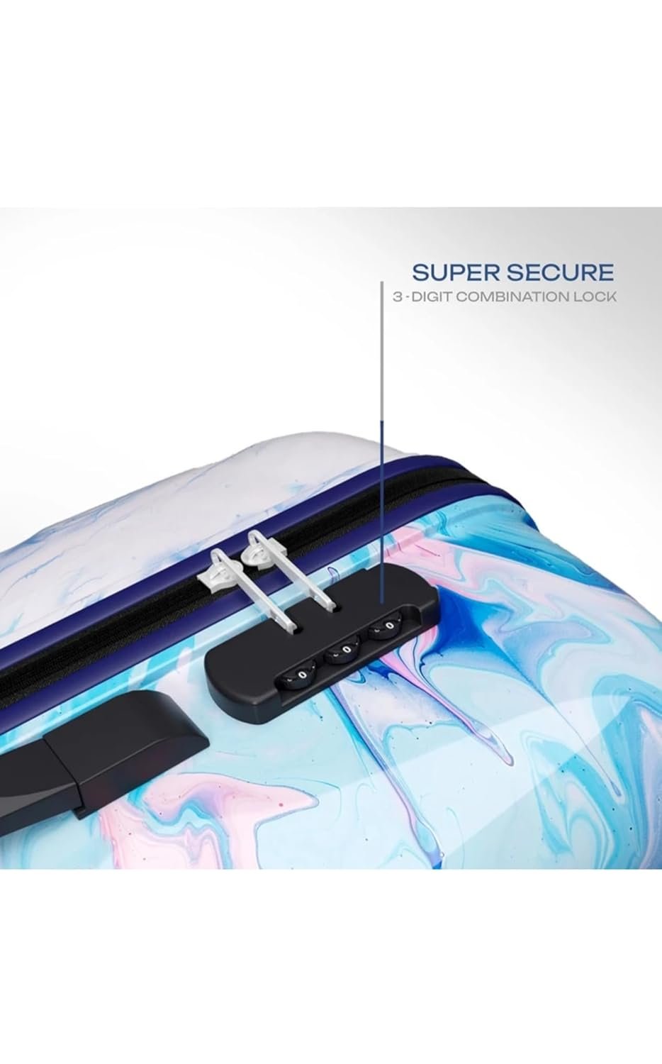 DESIGN FEATURES: Stylish marble-effect printed luggage set with blue and pink swirl pattern, featuring durable hard-shell construction and telescopic handles