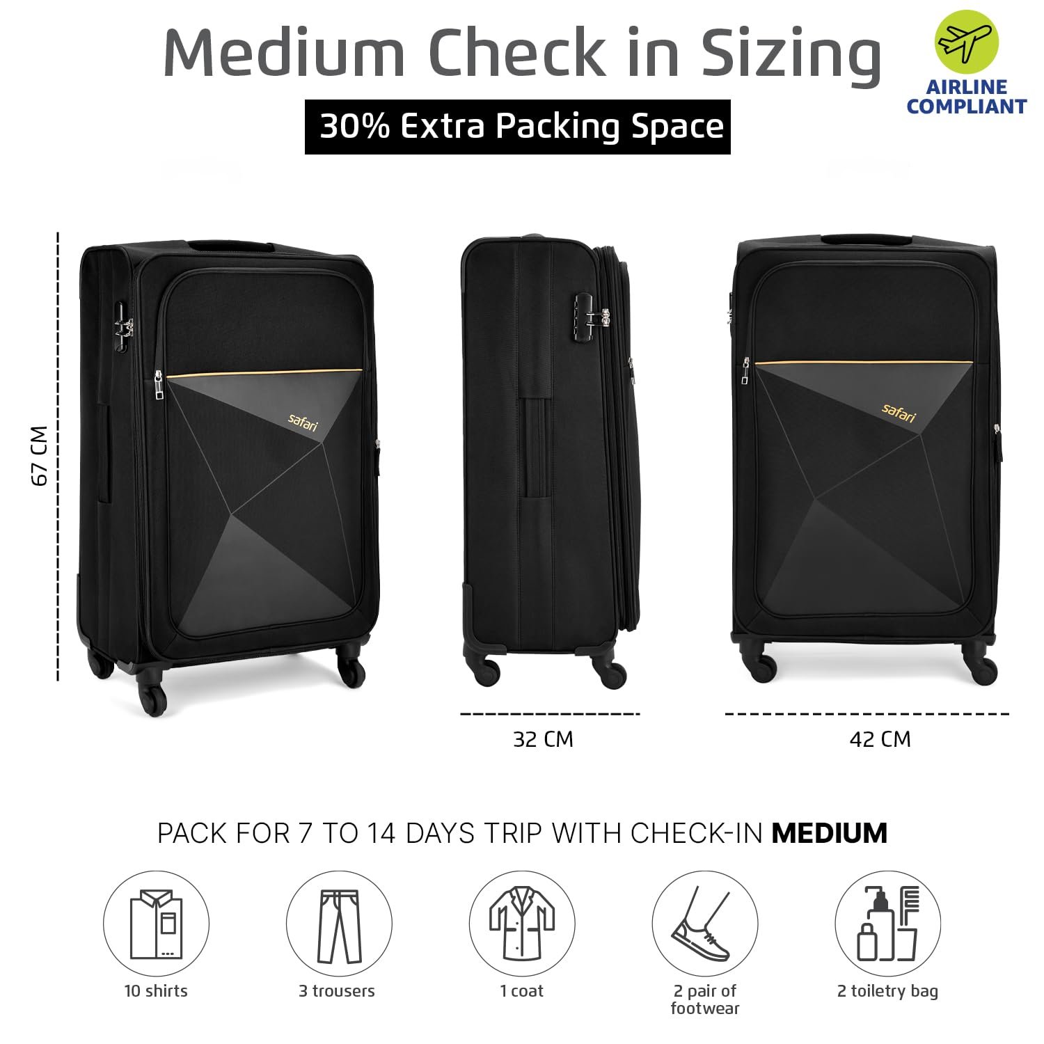 Safari Prisma – The perfect blend of style with functionality. Crafted from premium polyester, the luggage can stylishly withstand the rigors of modern travel. The trolley bag provides ample space for all travel essentials making it perfect for extended trips. Need more space? The expandable feature allows you to increase packing capacity BY 10%, accommodating those extra items picked up along your journey. Effortlessly glide through airports and streets with the 360 degree spinner wheels. Keep your belongings safe, with the integrated combination lock and sturdy zippers offering enhanced security. Whether you’re jetting off for a weekend getaway or an extended vacation, Safari Prisma is your perfect travel companion.