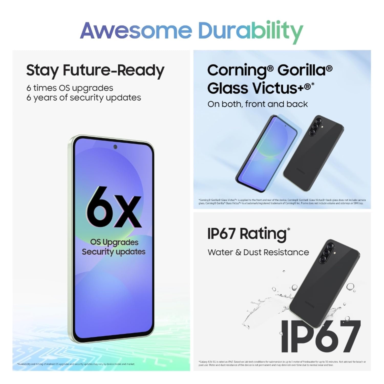 Design – Slimmest ever A Series (7.4 mm) phone with a premium glass back. 6.7” FHD+ sAMOLED display with Vision Booster. Key-island design for intuitive grip. Sleek and minimalist – floating camera layout.