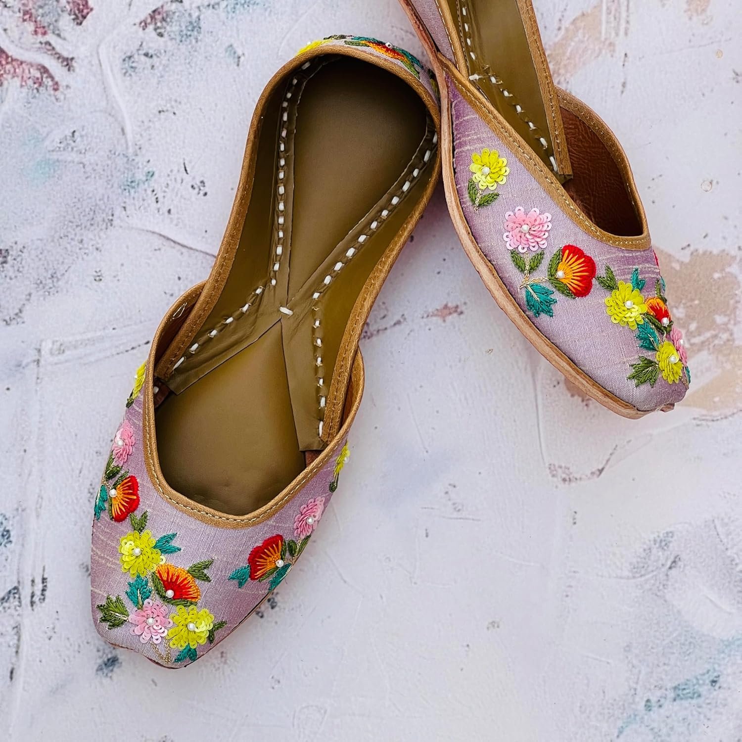 Elevate your traditional attire with these exquisite Punjabi juttis for women. Crafted with meticulous attention to detail, these handcrafted juttis boast an intricate embellishment of shimmering pearls and delicate embroidery, creating a captivating floral motif that adorns the uppers. The soft leather interior ensures unparalleled comfort, while the durable soles provide excellent traction. These juttis are the epitome of elegance and sophistication, perfect for complementing your ethnic ensembles at weddings, festivals, or any special occasion. Indulge in the timeless charm of these Punjabi juttis and embrace the essence of Indian artistry with every step.