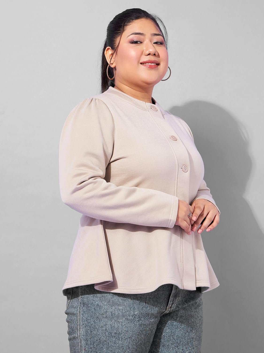 Grey Fleece Button Peplum Jacket, in Fleece fabric, Unlined, Regular Length, Fit And Flare, Button Closure, Straight Hemline and features Button Detail At Front
