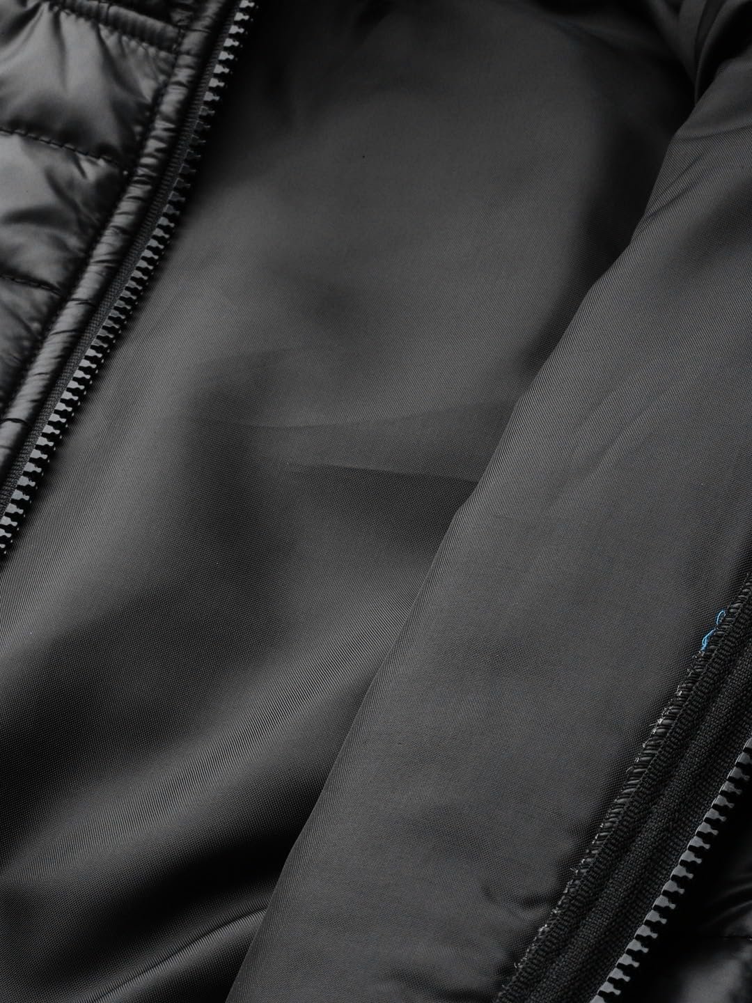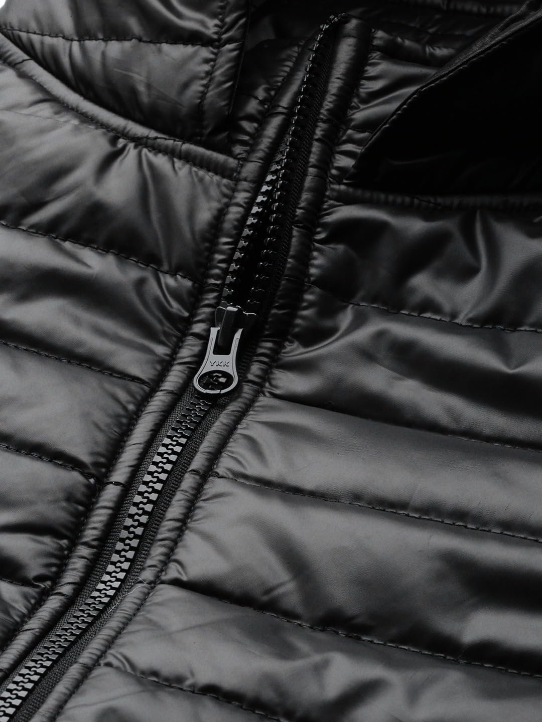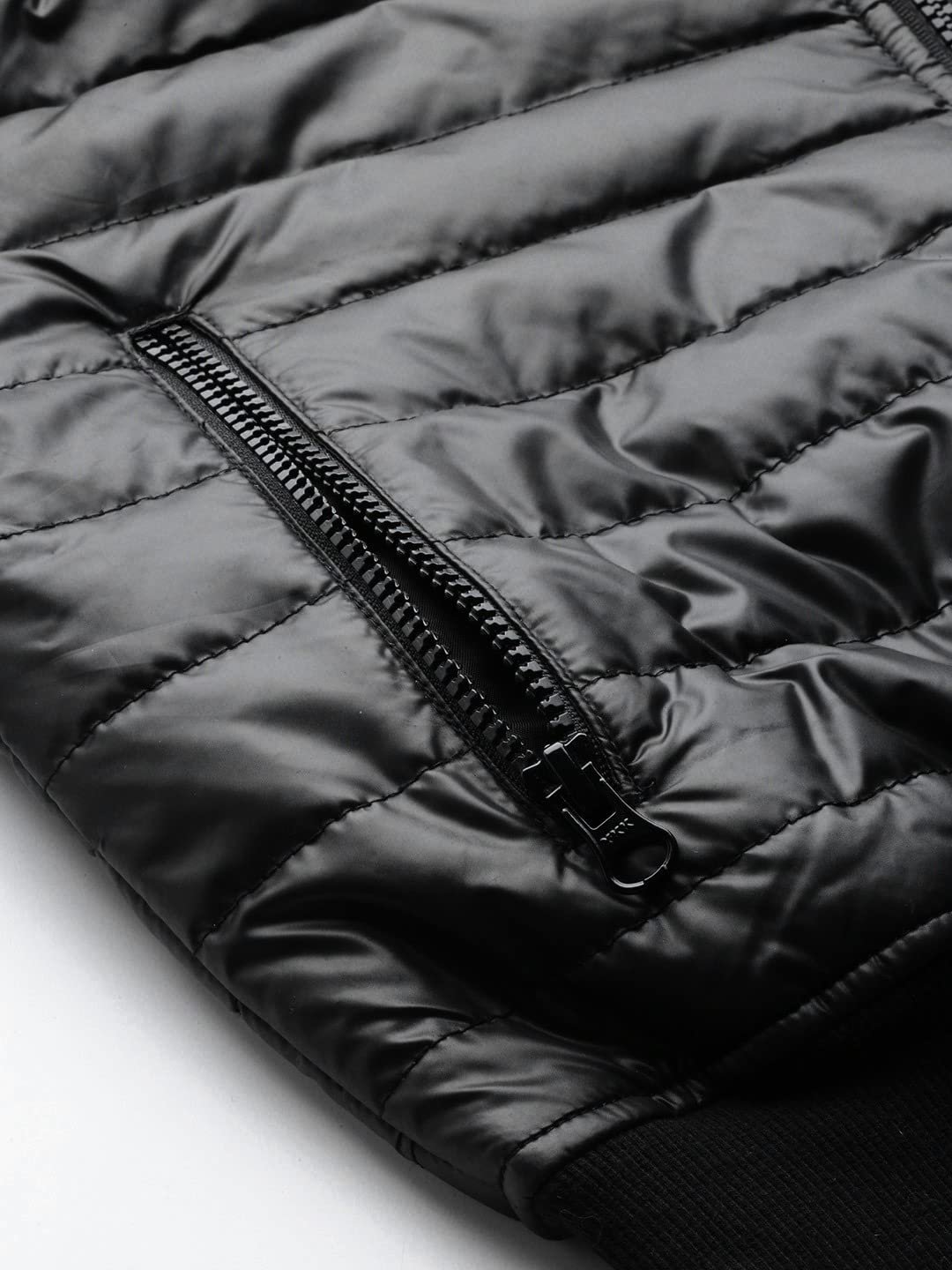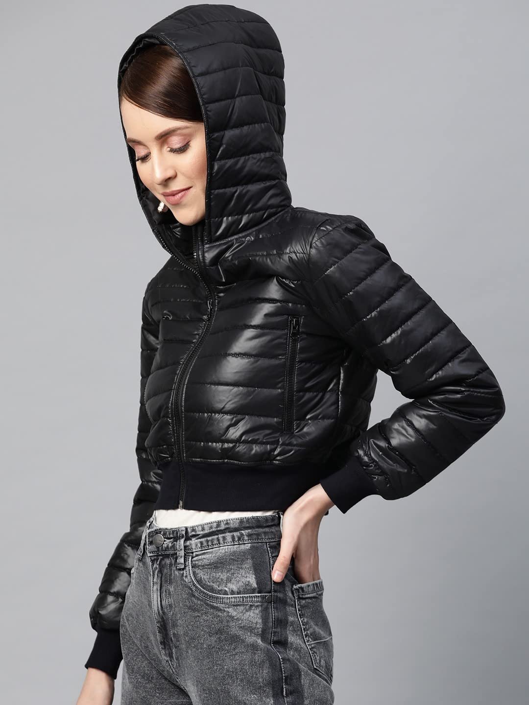 Black Hooded Crop Bomber Puffer Jacket , in Taffeta fabric, Polyester Lining, Cropped Length, Comfort Fit, Zipper Closure, Straight Hemline and features Hodded Detail