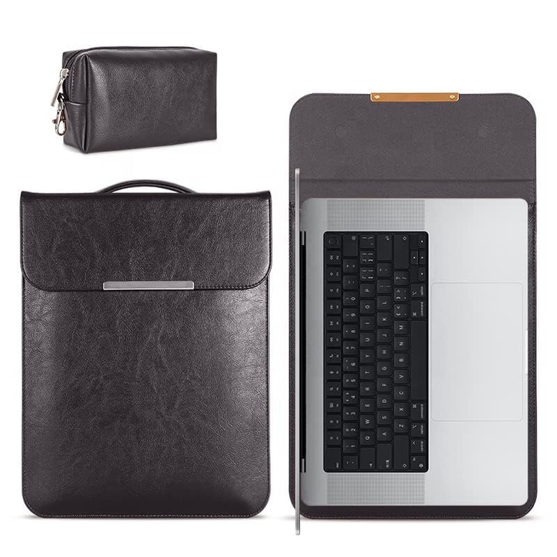 SwooK 15-16 Inch Laptop Sleeve with Handle & Pouch – Waterproof PU Leather Slim Case Compatible with MacBook Pro 16″, Dell XPS 15, Lenovo, HP, ASUS – Scratch Resistant, Velvet Lined- Coffee