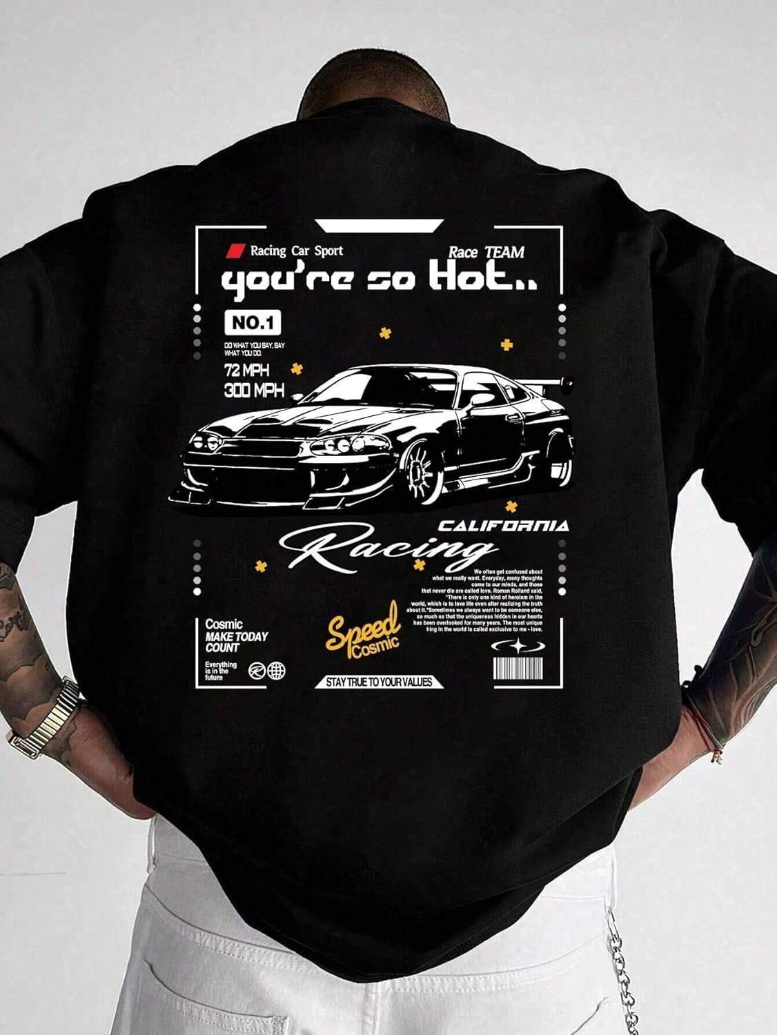 Make a bold statement with this striking oversized baggy t-shirt featuring an eye-catching racing car design. The black shirt showcases a dramatic California racing theme with a sleek sports car illustration and stylish typography. The back graphic includes speed metrics, racing team details, and motivational text that reads ‘you’re so hot’, creating an aesthetic streetwear vibe. Perfect for automotive enthusiasts and fashion-forward individuals, this t-shirt combines comfort with urban style. The baggy fit offers a relaxed, contemporary silhouette that’s on-trend with current fashion. The detailed graphic print features white and gold accents that pop against the black fabric, while the cosmic-inspired elements add a unique touch. Whether paired with jeans, cargo pants, or shorts, this t-shirt delivers both style and comfort for casual outings or car meets.