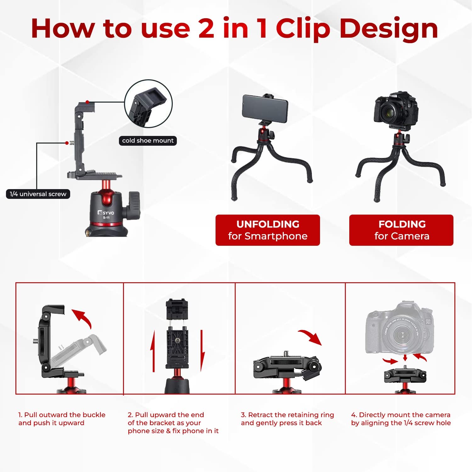 Syvo S-11 Camera Tripod, Flexible Gorilla Tripod Stand with Hidden Phone Holder w Cold Shoe Mount, 1/4” Screw for Magic Arm, Universal for iPhone 14 13 Pro XS Max Samsung Canon Nikon Sony Cameras