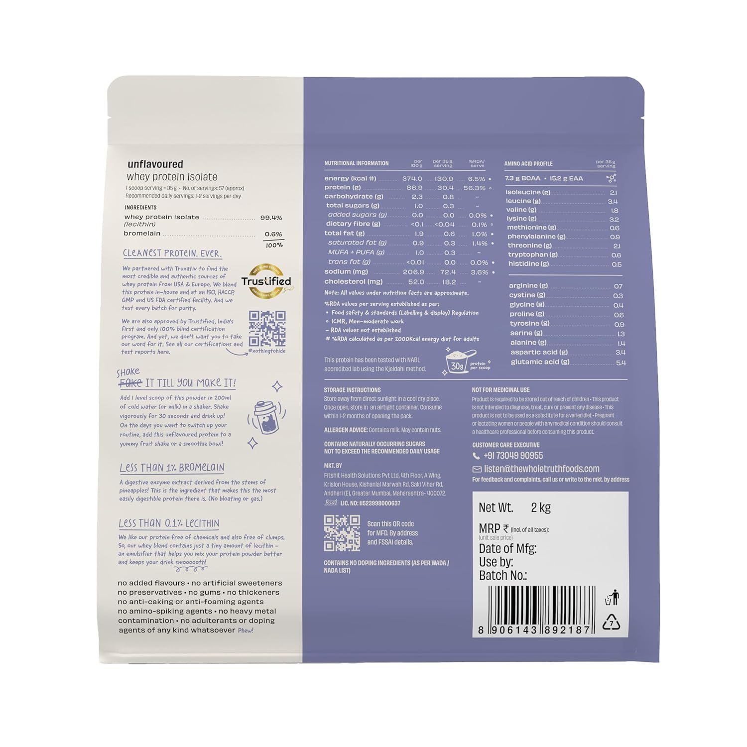 Trustified gold certified: India’s first and only 100% blind testing agency certifies The Whole Truth protein powder for accuracy of label claims (precise protein content, no amino spiking) and purity (free from heavy metals or biological contaminants).