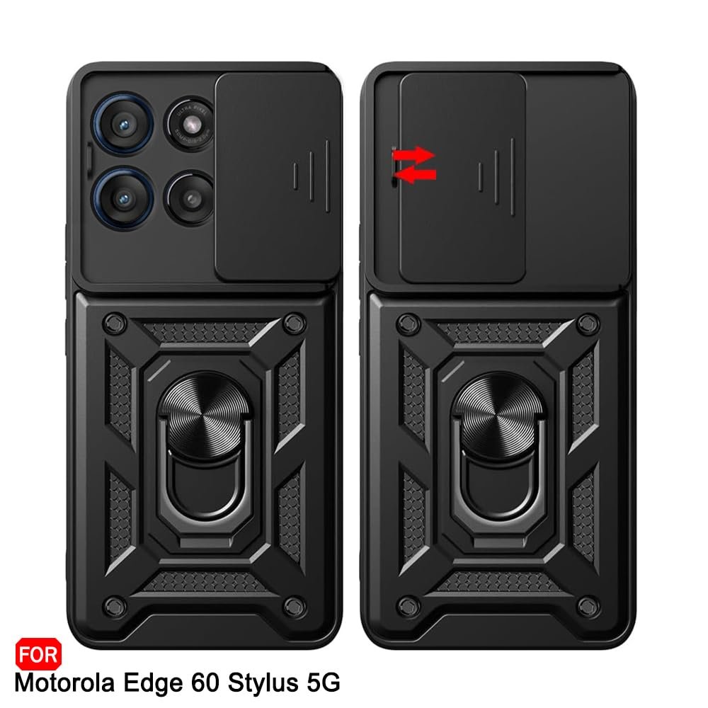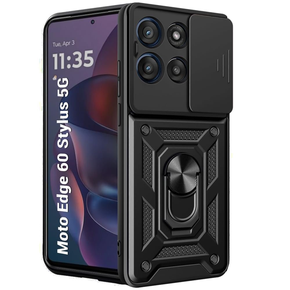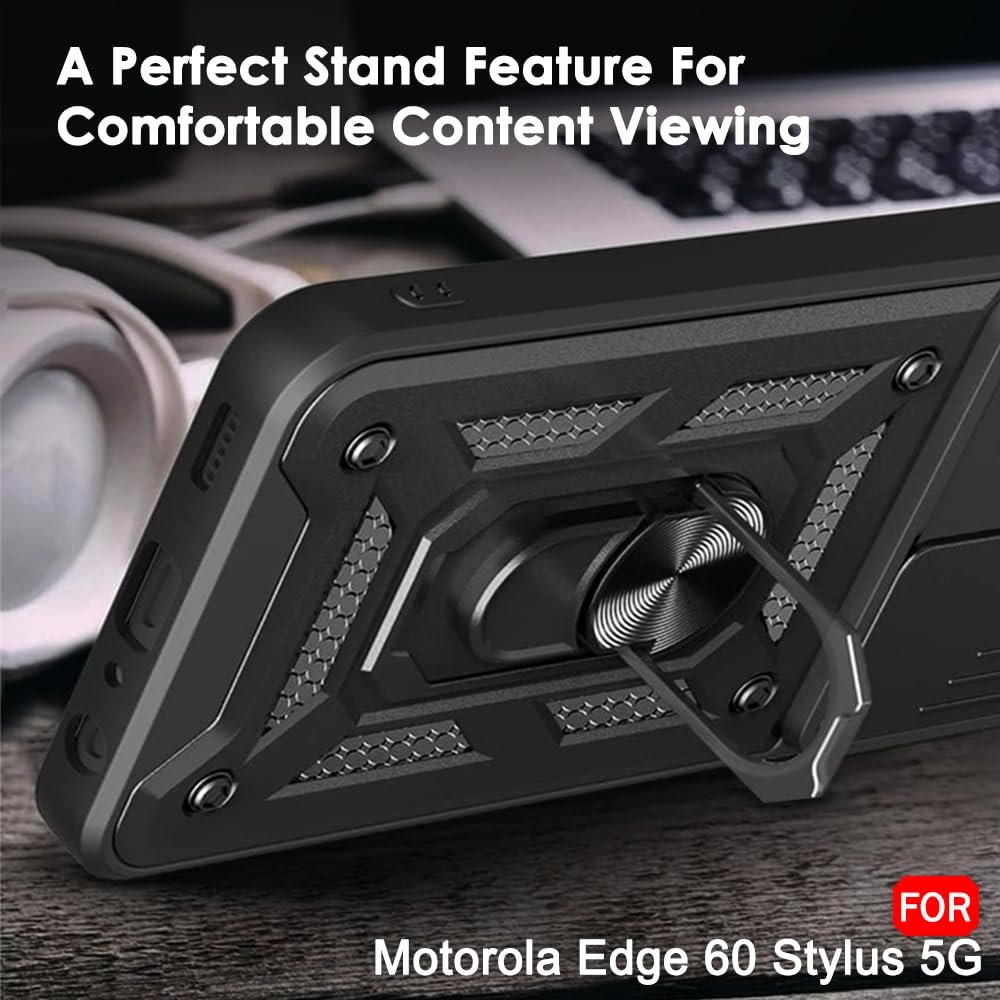 TheGiftKart Tough Armor Bumper Back Cover Case for Motorola Moto Edge 60 Stylus 5G | Kickstand & Ring Holder | 360° Protection Cover for Moto Edge 60 Stylus (PC & TPU, Sliding Camera Cover, Black)