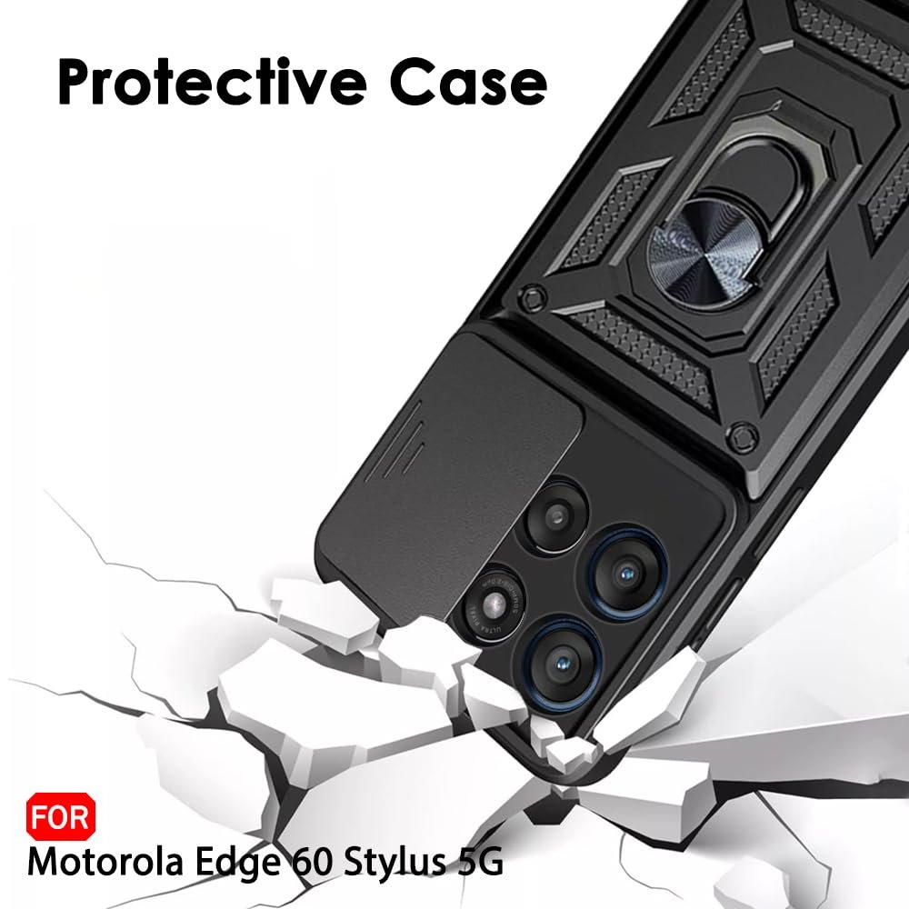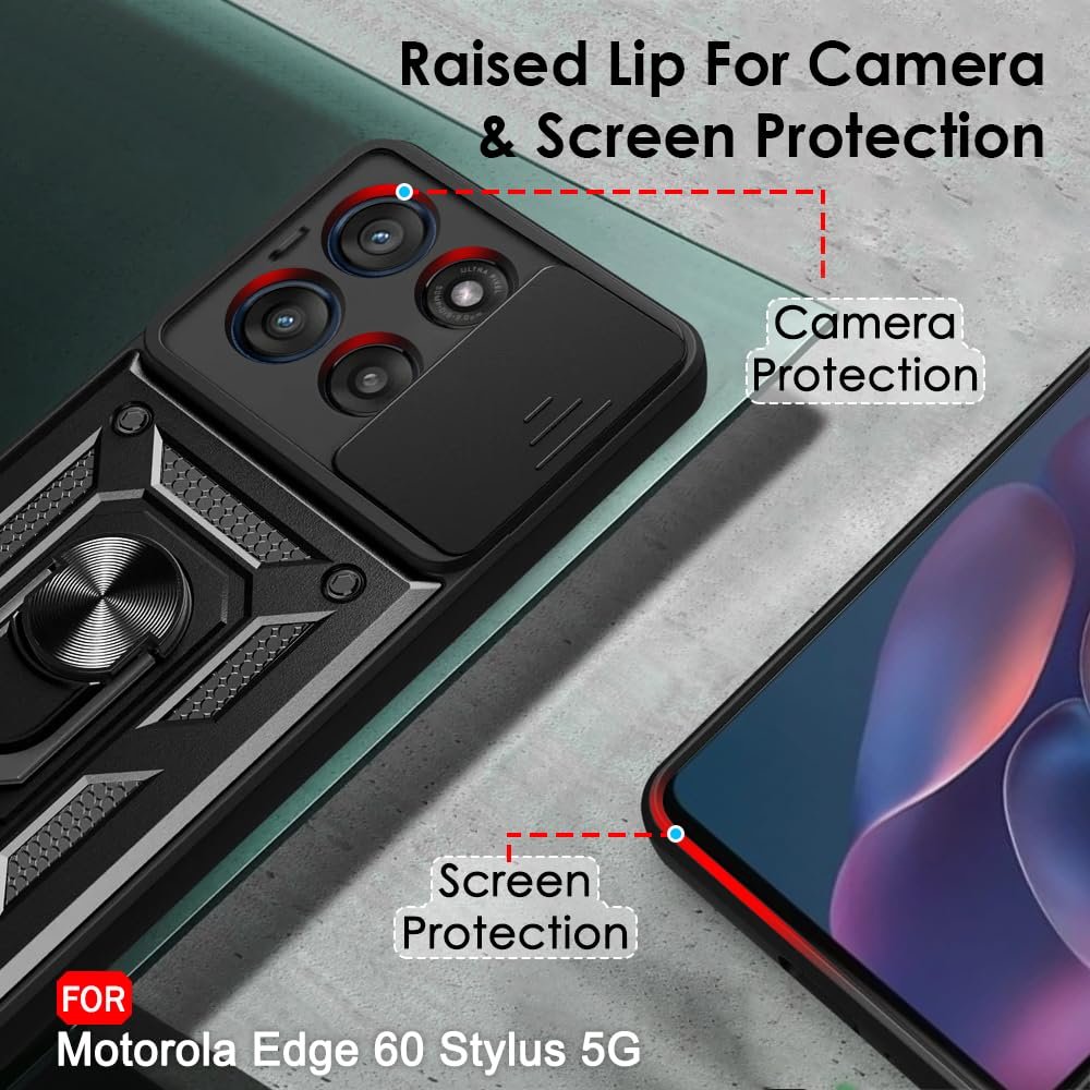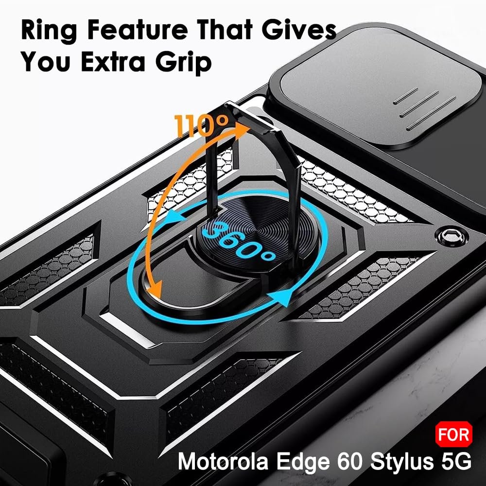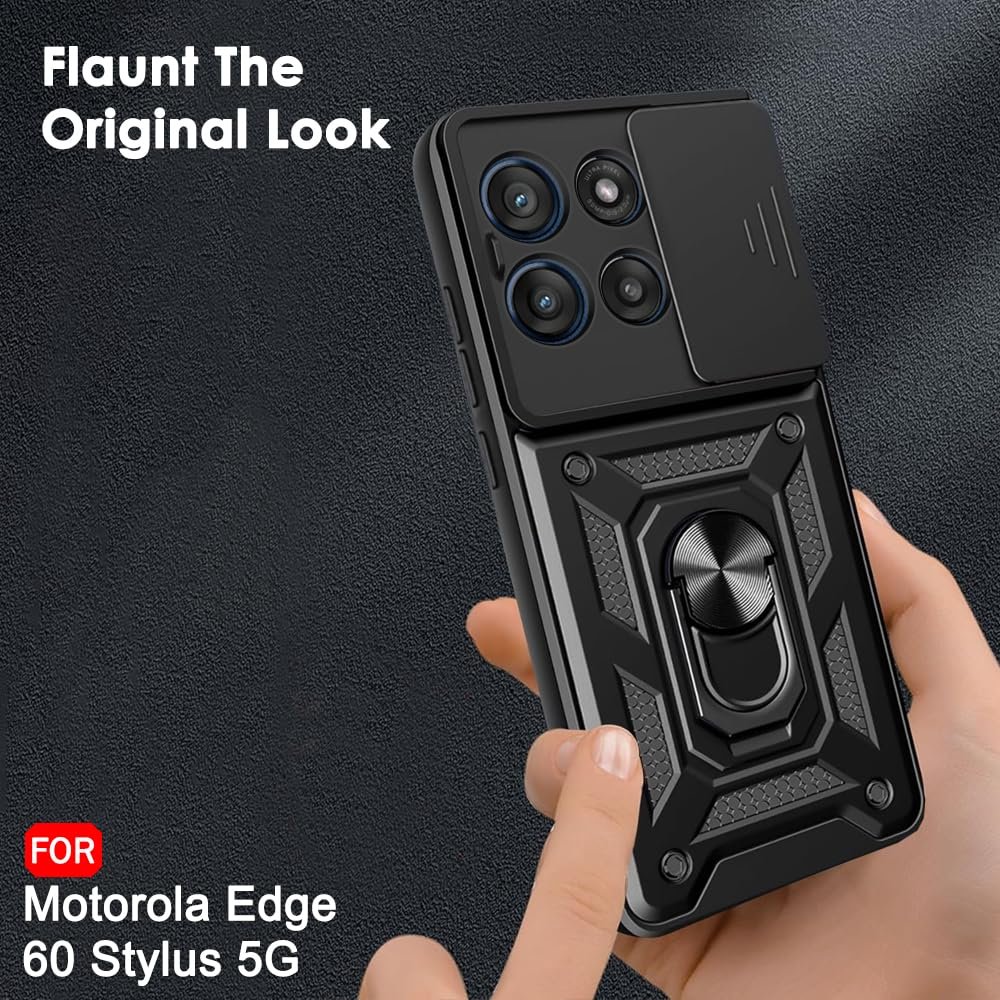 TheGiftKart Tough Armor Bumper Back Cover Case for Motorola Moto Edge 60 Stylus 5G | Kickstand & Ring Holder | 360° Protection Cover for Moto Edge 60 Stylus (PC & TPU, Sliding Camera Cover, Black)