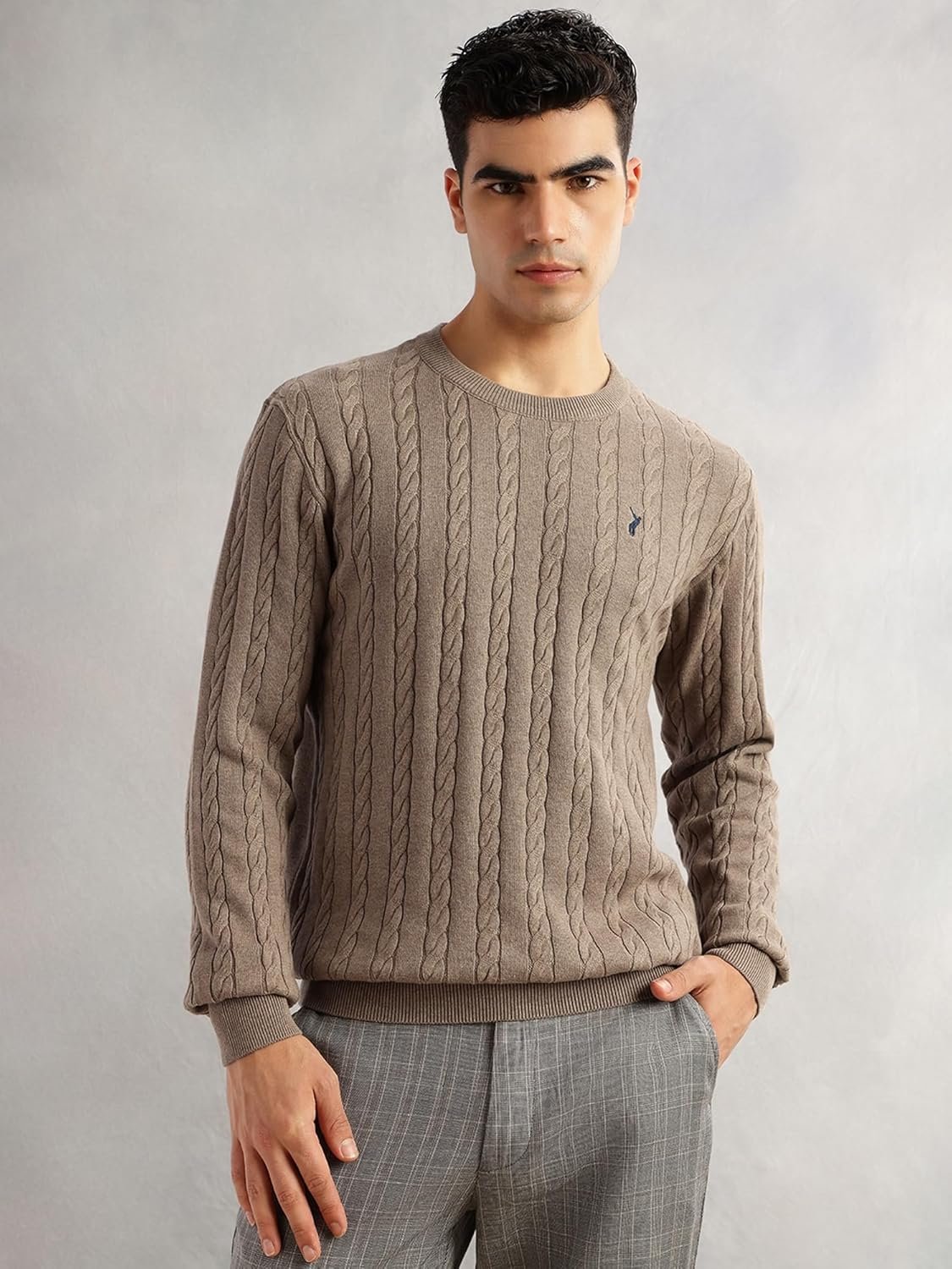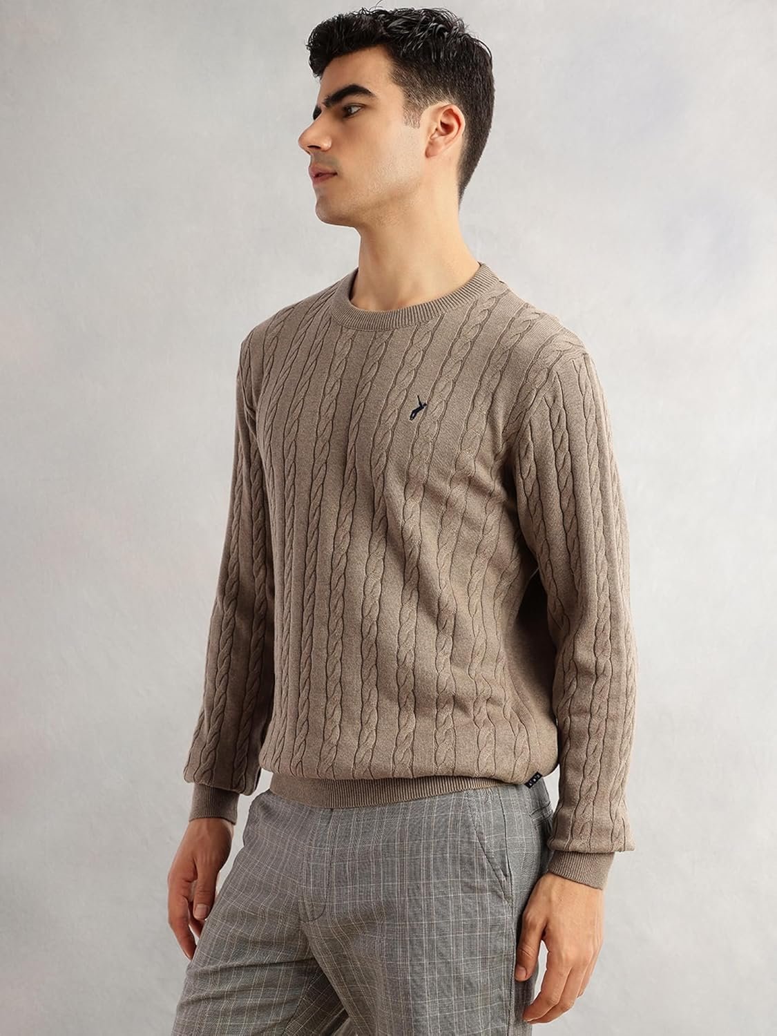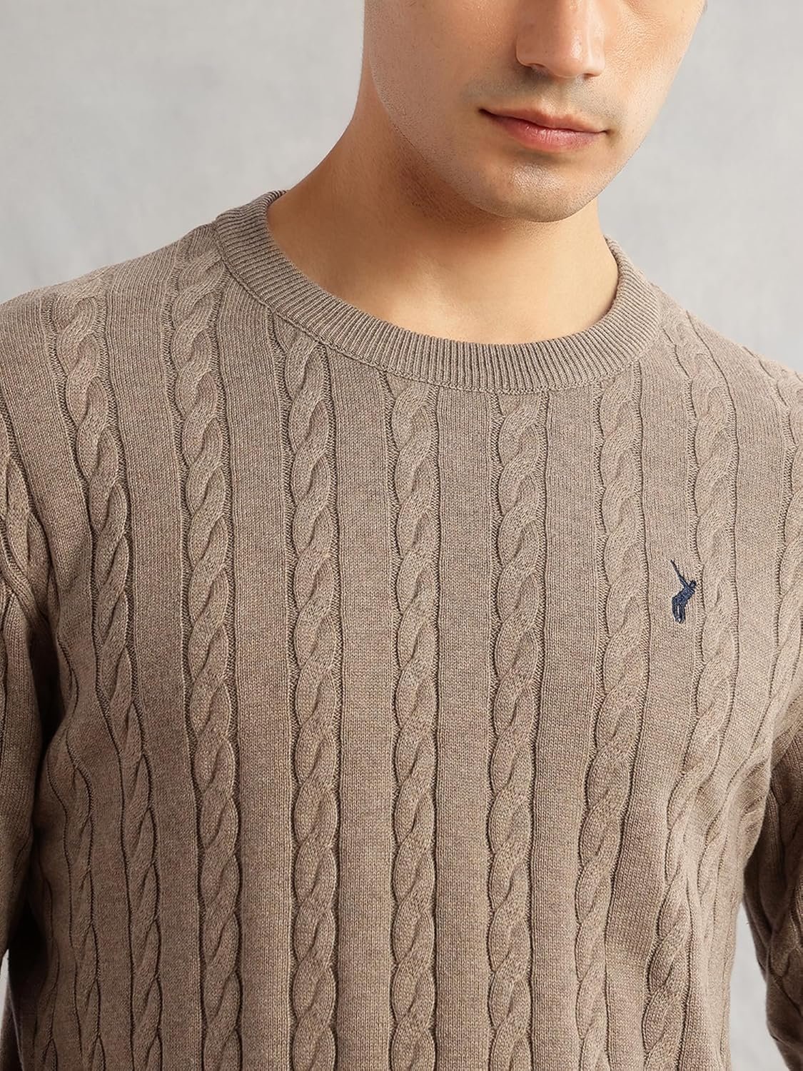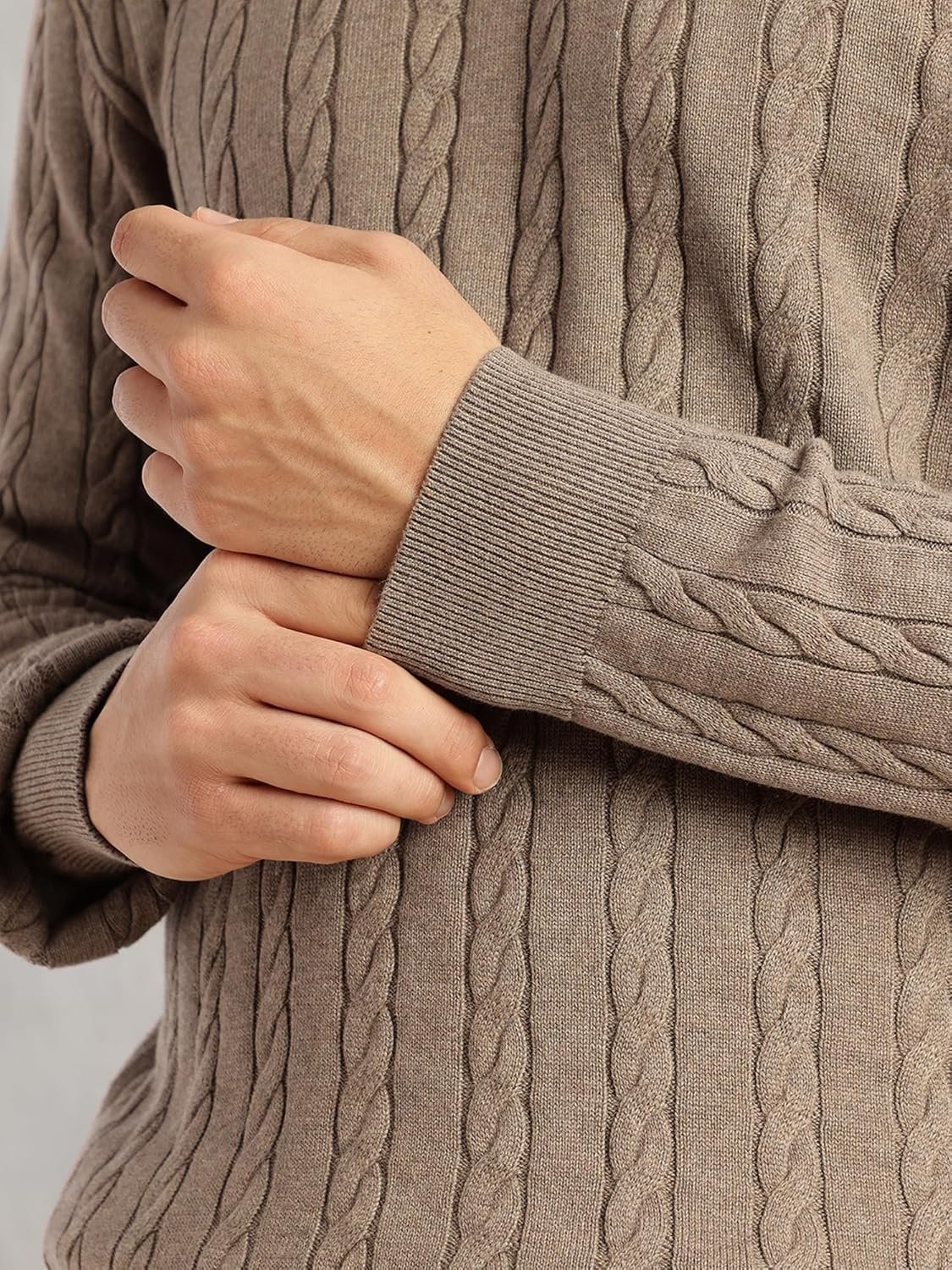 Stay cozy and stylish with this classic Cable Knitted Pullover Sweater, designed for men who value both comfort and timeless fashion. Made from 100% cotton, this sweater features a rich cable knit texture with a subtle self-design, long sleeves, and a clean round neck. Ideal for layering during cooler months, it offers breathable warmth and a polished casual look that works from day to night.