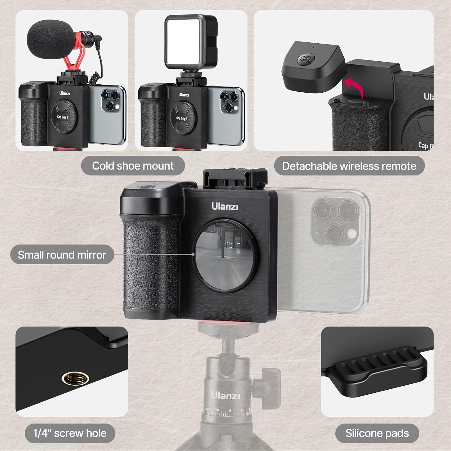 【Universal 1/4″ Standard Screw & Cold Shoe Mount】Features a 1/4″-20 female thread & cold shoe mount design. The cold shoe on the top of the grip allows you to mount a cold shoe mount external LED lamp or microphone. A 1/4″-20 female thread on the bottom allows you to mount it on a phone holder.
