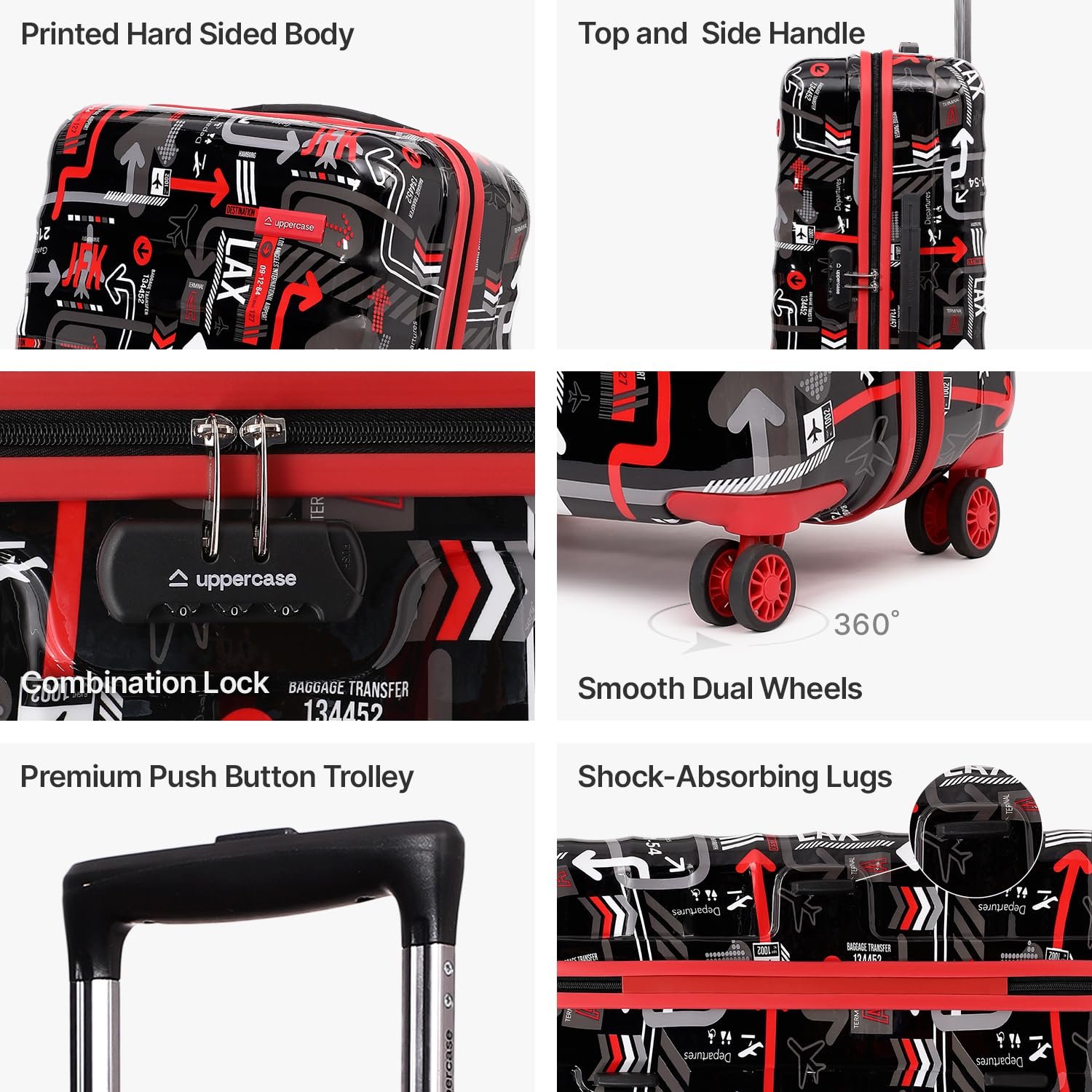 SHOCK ABSORBING LUGS & IN-BUILT COMBINATION LOCK – Safeguard your belongings with the uppercase Trolley Bags, equipped with shock-absorbing lugs for superior protection during travels. To bolster security, each bag now includes a built-in combination lock, ensuring your items arrive at your destination in the same pristine condition as when you packed them, providing peace of mind throughout your journey.