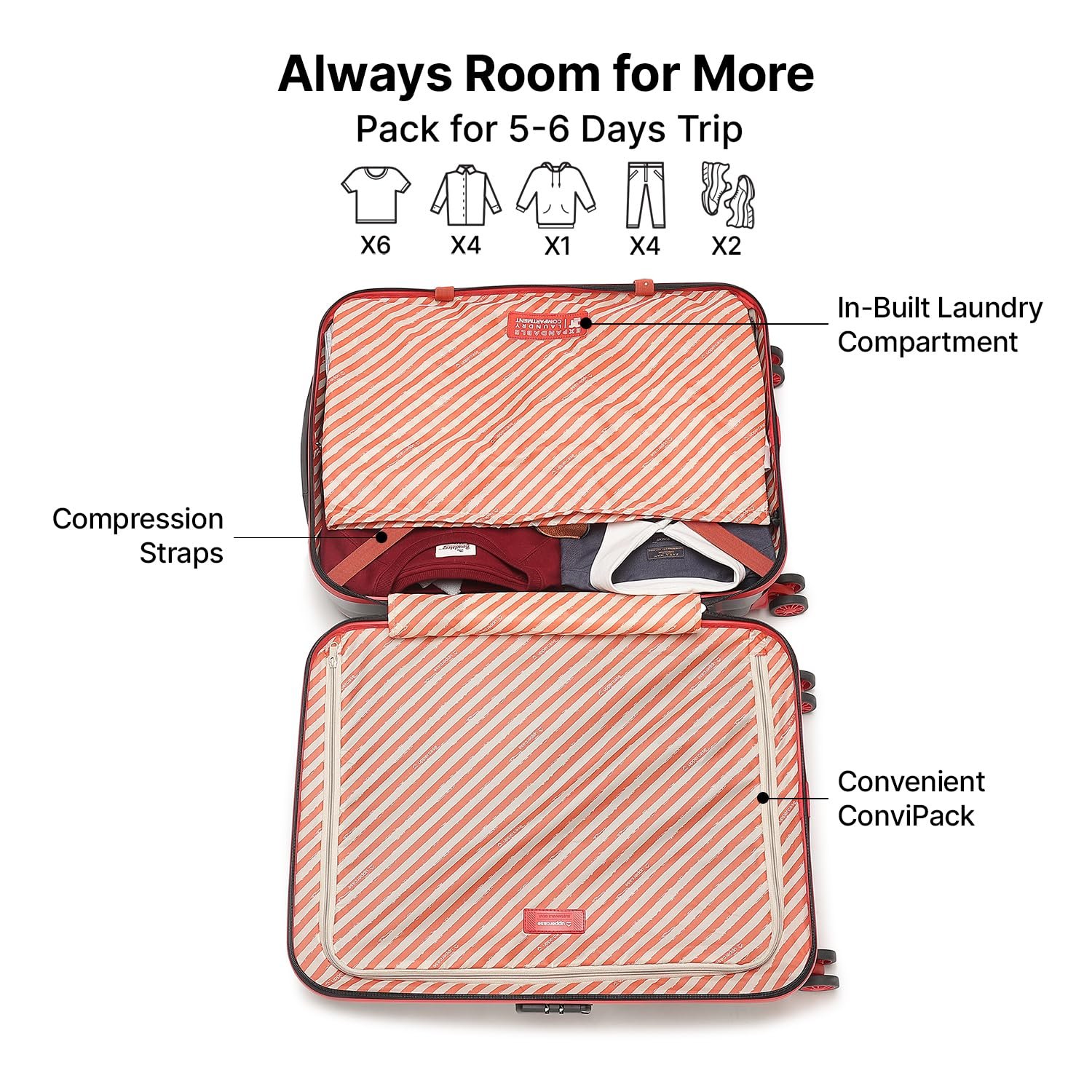 One side Convi Pack with a Wet Pouch One side Convi Pack Cushioned Interiors with Dual Convi Pack and a Wet Pouch