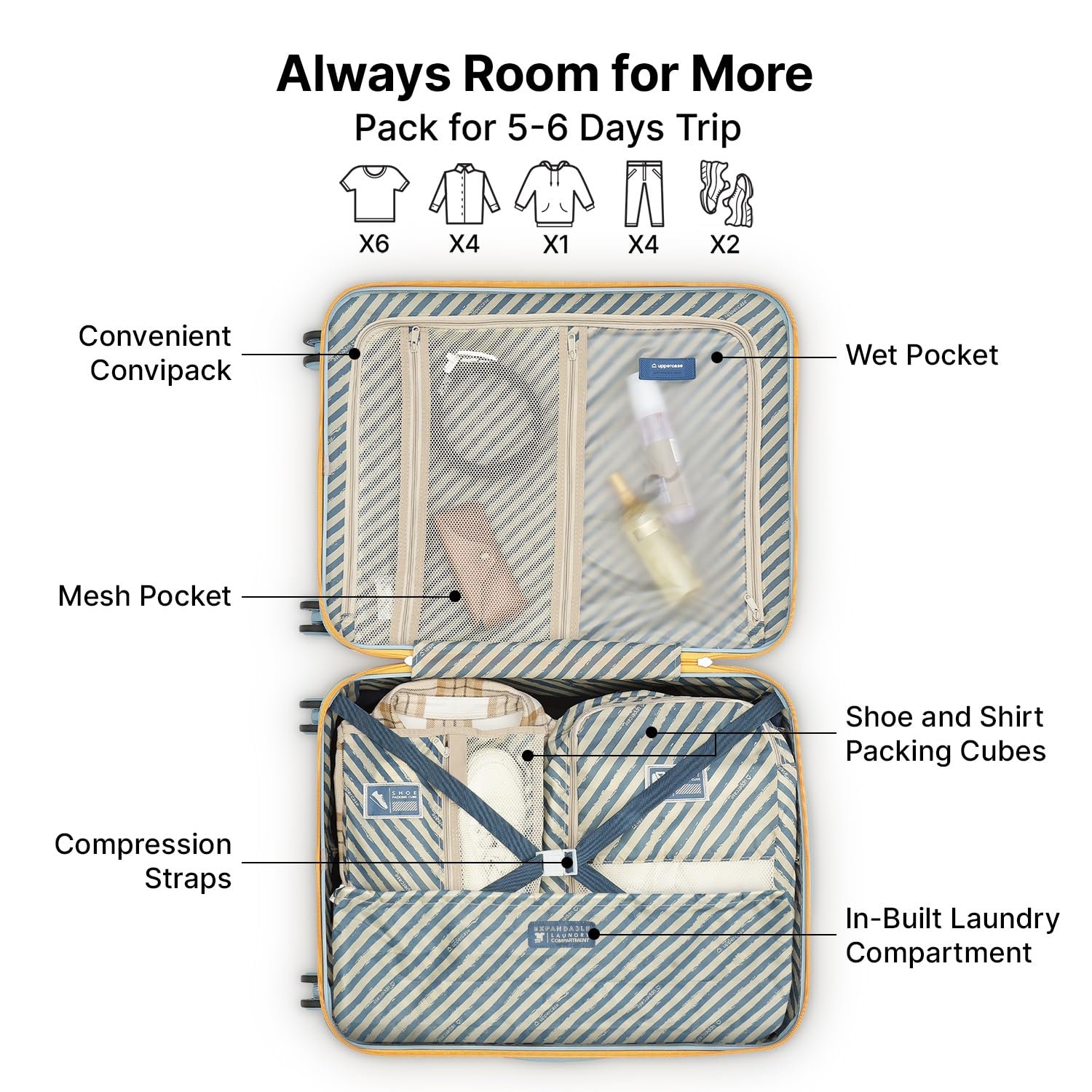 TSA LOCK & ANTI-THEFT ZIPPERS- Ensure the safety of your belongings with the uppercase Topo Trolley Bags, featuring shock-absorbing lugs that offer superior protection throughout your travels. The Topo suitcase is equipped with a TSA lock for enhanced security, accompanied by Anti-Theft Zippers for added protection. It also includes dedicated packing cubes for shoes and shirts, ensuring efficient organization across all sizes.