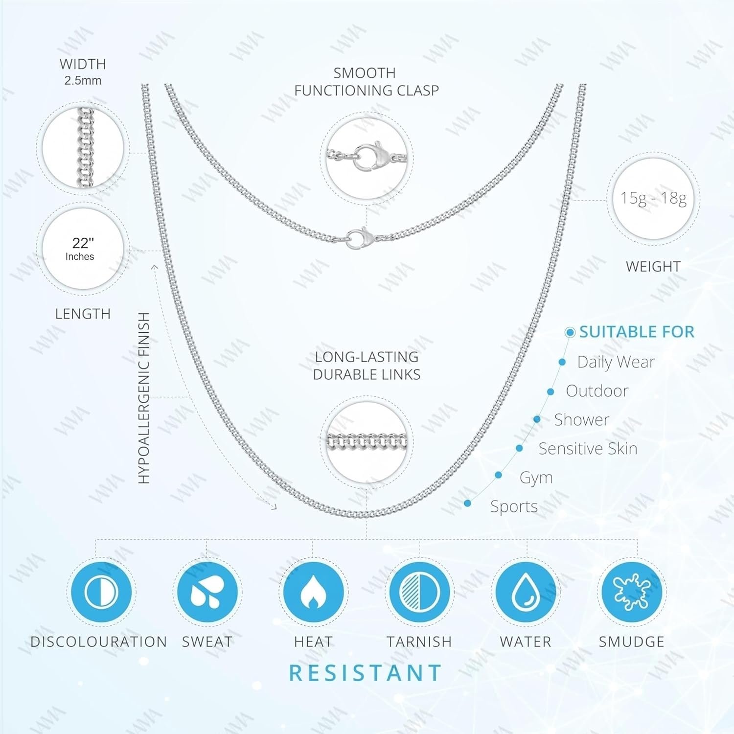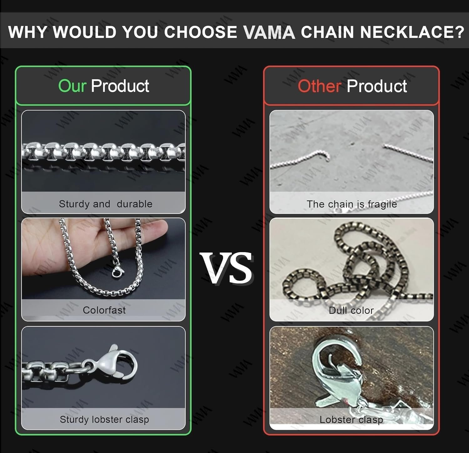 Tarnish Resistant: thick layer of electrophoretic protective, long lasting color retetion.Shine: high polishing process make it more shining than others.Waterproof: titanium steel material so you can wear it all days without turning green.Durable: clasp won’t be easy broken, made for long lived