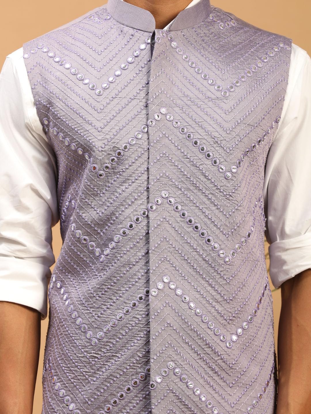 VASTRAMAY Men’s Mirror Work Nehru Jacket | Mirror Work Chevron Pattern Chic Jacket For Men