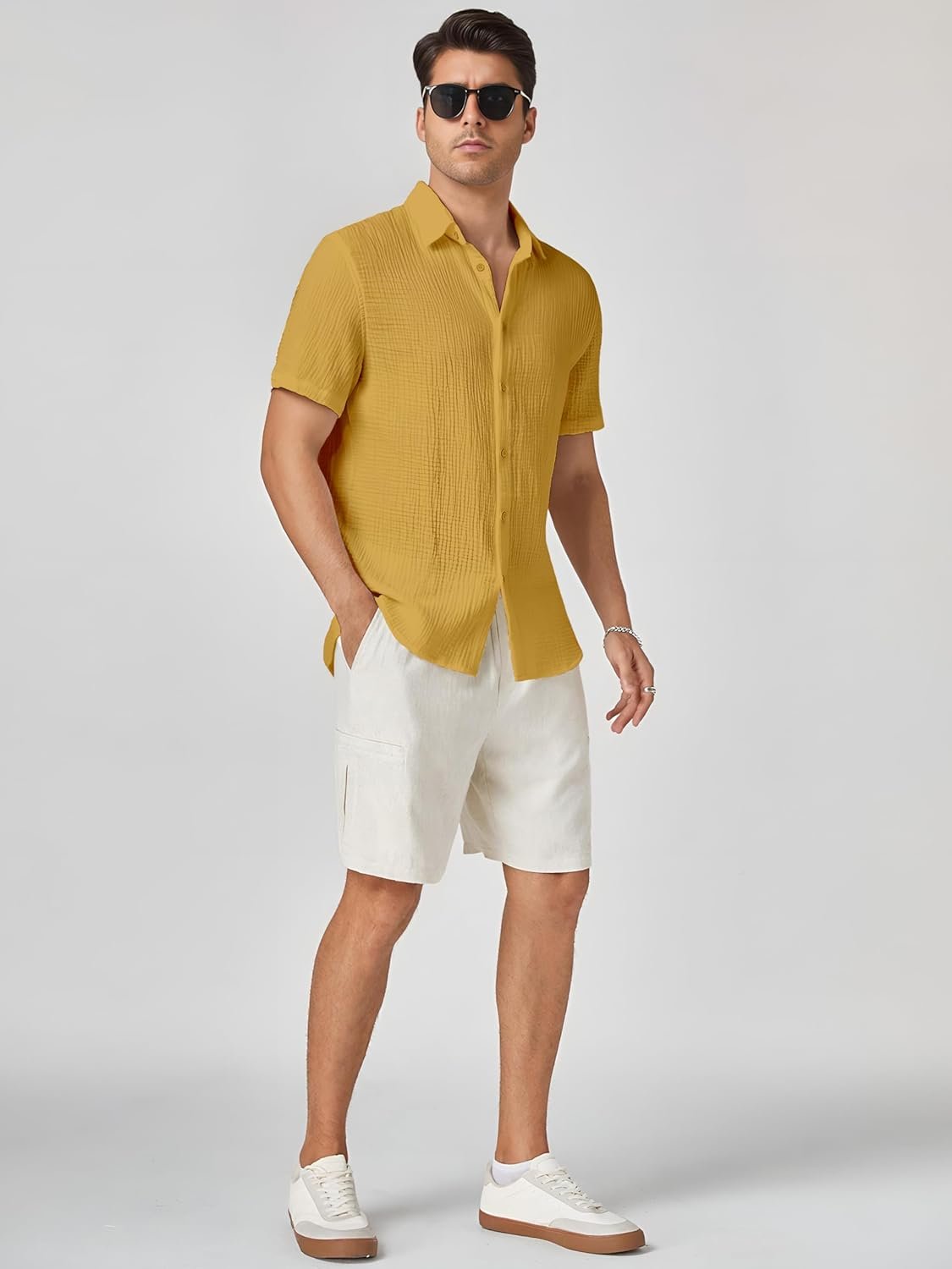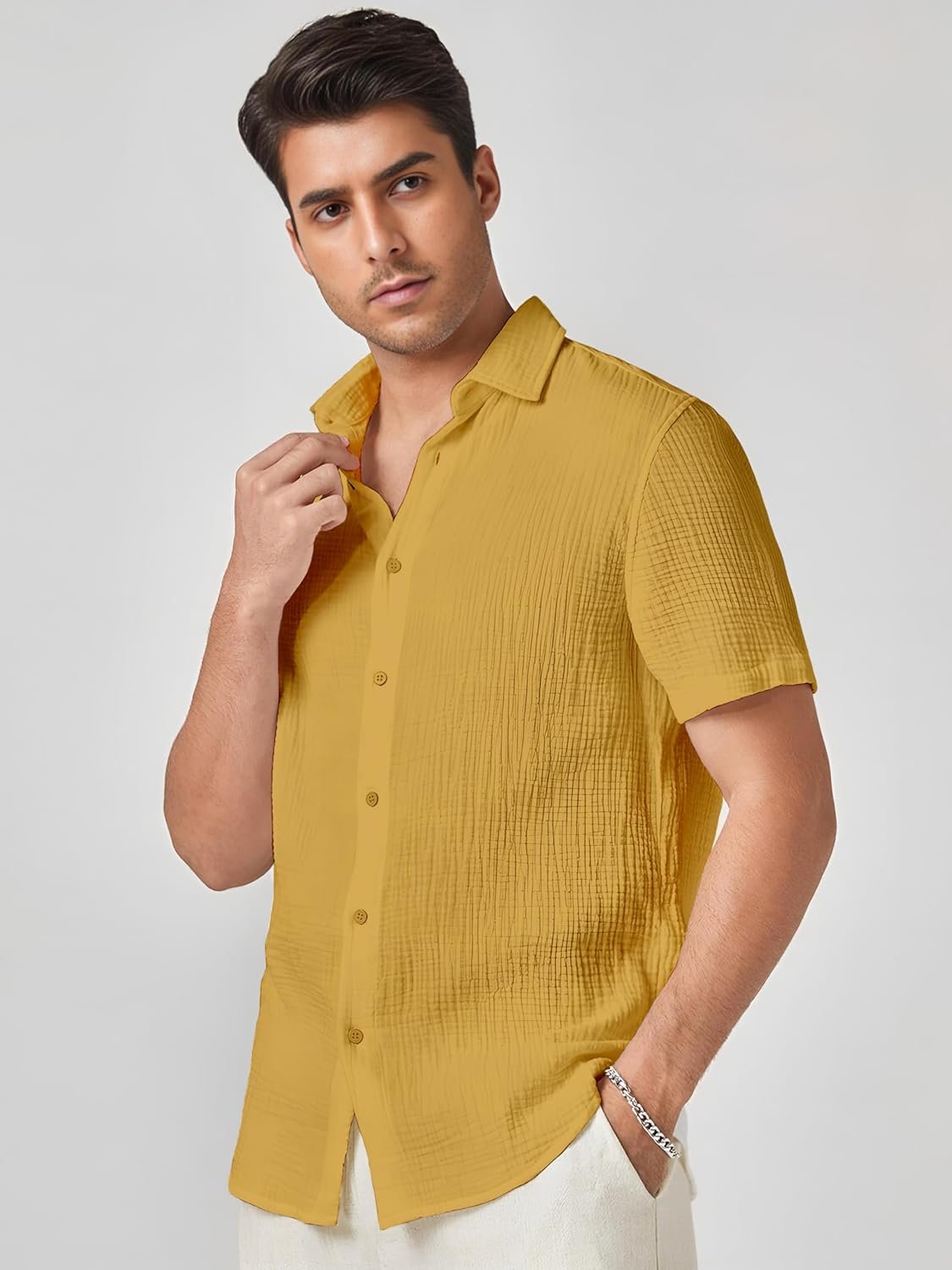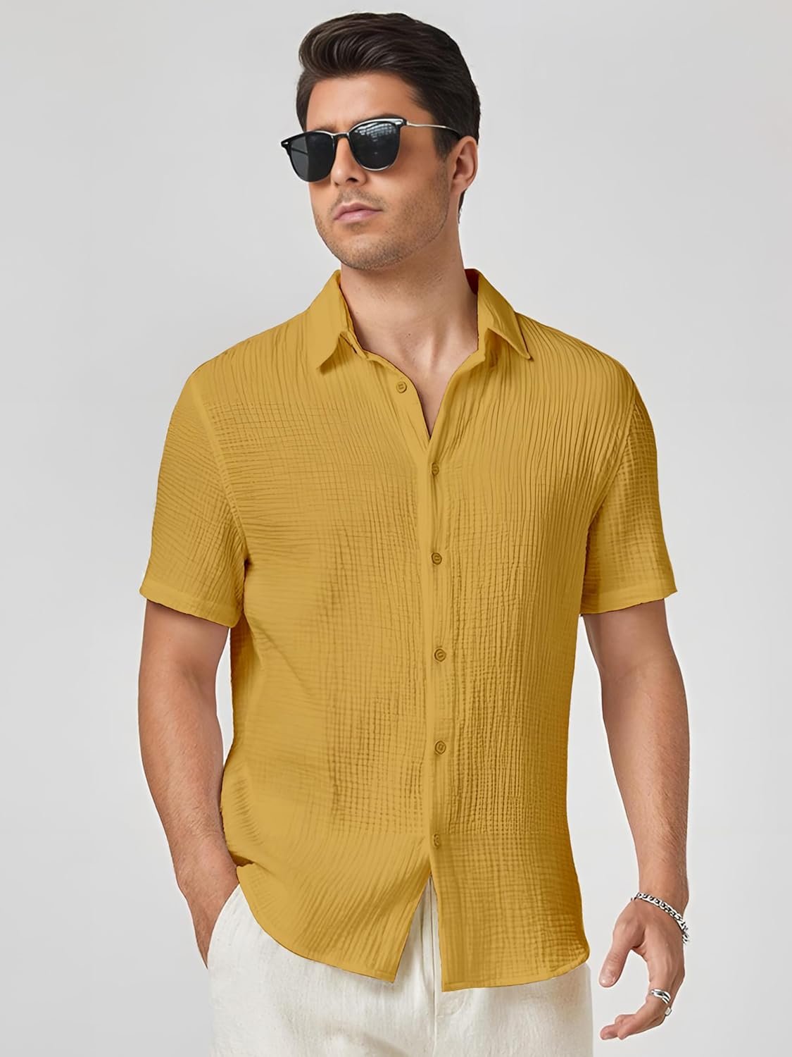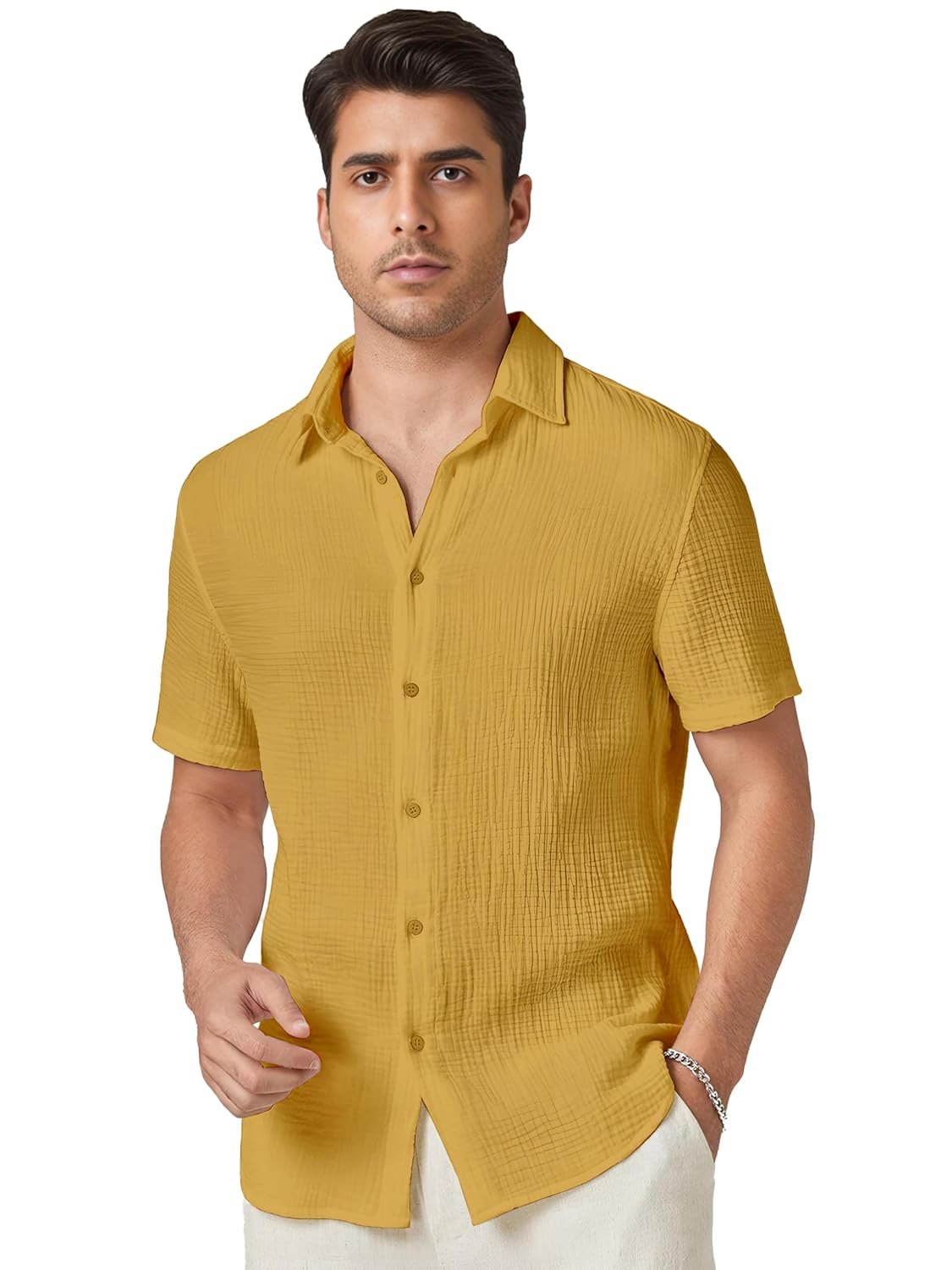 Exude sophistication and style with this crisp shirt from our premium collection. Crafted from high-quality fabric, this garment offers unparalleled comfort and breathability, making it a perfect choice for warm weather. The intricate texture and subtle sheen add an elegant touch to the design. With a relaxed fit and short sleeves, this shirt allows for effortless movement while maintaining a polished appearance. Pair it with complementary trousers or jeans for a versatile and refined look suitable for both casual and semi-formal occasions. Meticulously tailored to ensure a flattering silhouette, this shirt is a must-have addition to any discerning man’s wardrobe. Embrace timeless fashion and elevate your style with this exceptional piece.