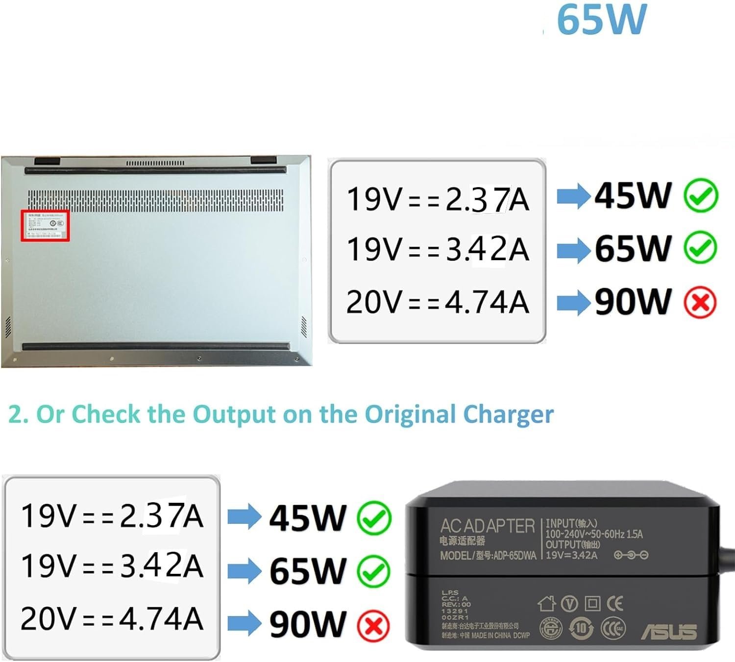 Output: 19V, 3.42A, 65W (Also Compatible with 45W, 19V, 2.37A); Input: 100-240V ; Connector: 4.0*1.35 mm.