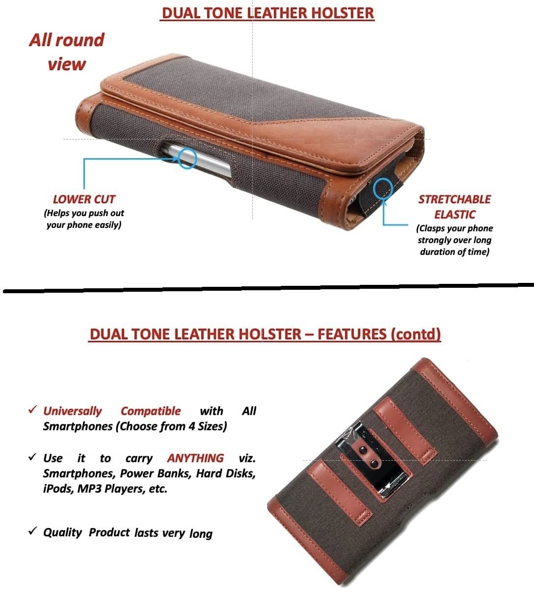 This is a Universal Long Lasting Leather Carry Case Cover Pouch With Hidden Magnetic Closure For Closing The Case.Perfect Fit For Travel And Carrying Your Mobile On Bike.Wear Your Phone Sideways On Your Belt And Always Have It At Your Reach. Provides Excellent Protection From Scratches, Dirt And Shocks. It has a Leather Wrapped Metal Clip And Also A Belt Loop In Case You Want That Extra Security.Keep Your Mobile Safe In Executive Style with this Leather Pouch Case.