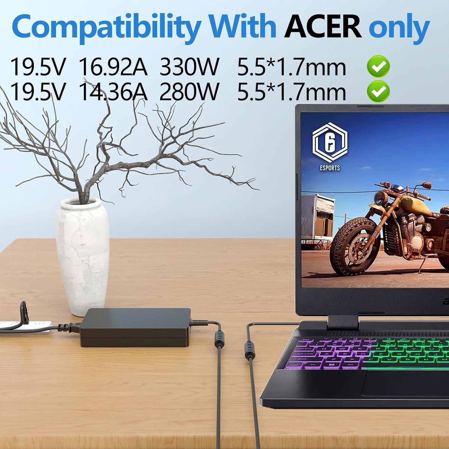 AC Input Voltage: 100-240V 50-60Hz DC Output: 19.5V 16.92A (Compatible with 19.5V 14.36A) Output Power: 330W (Compatible with 280W) Connector: 5.5mm*1.7mm (Compatible FOR ACER Only)