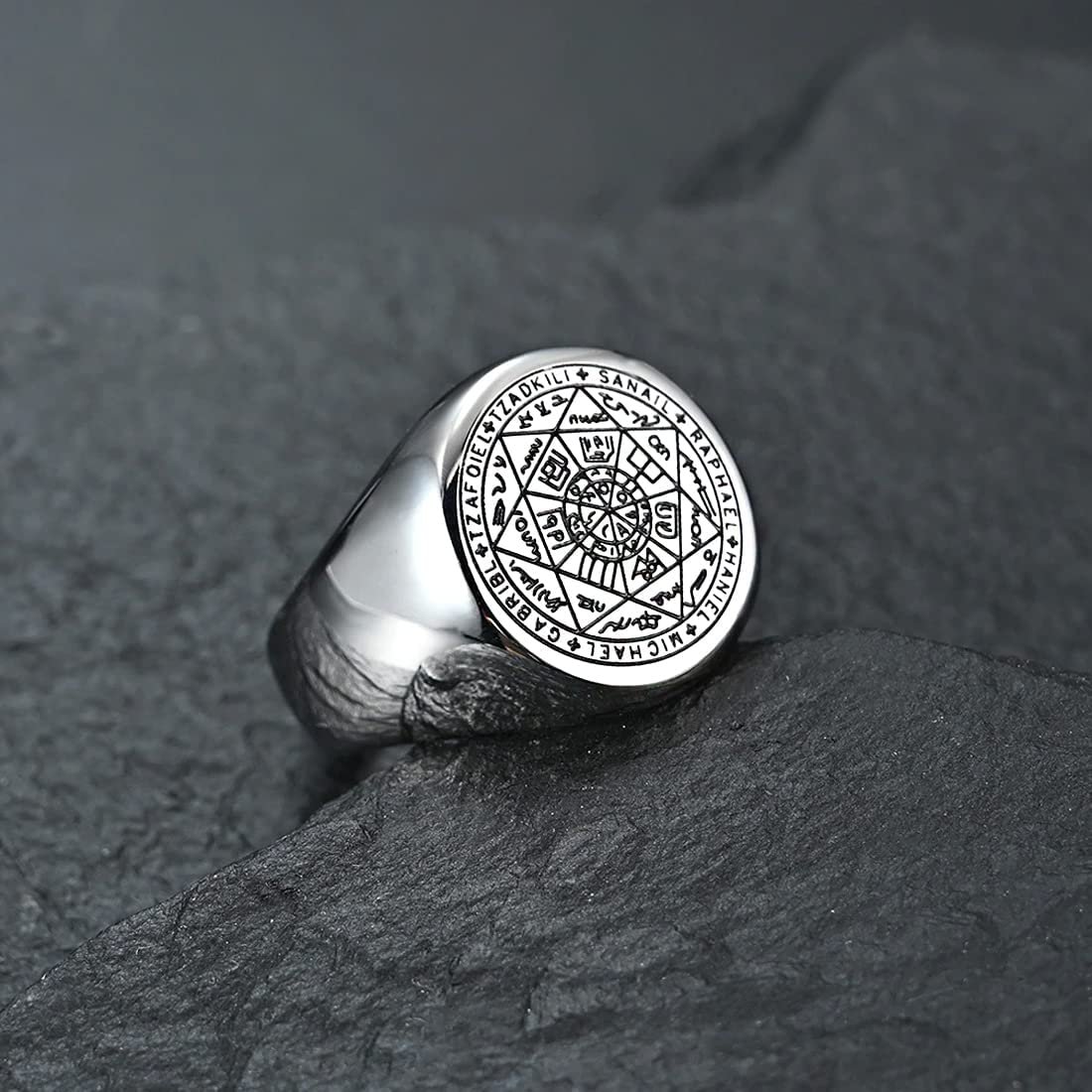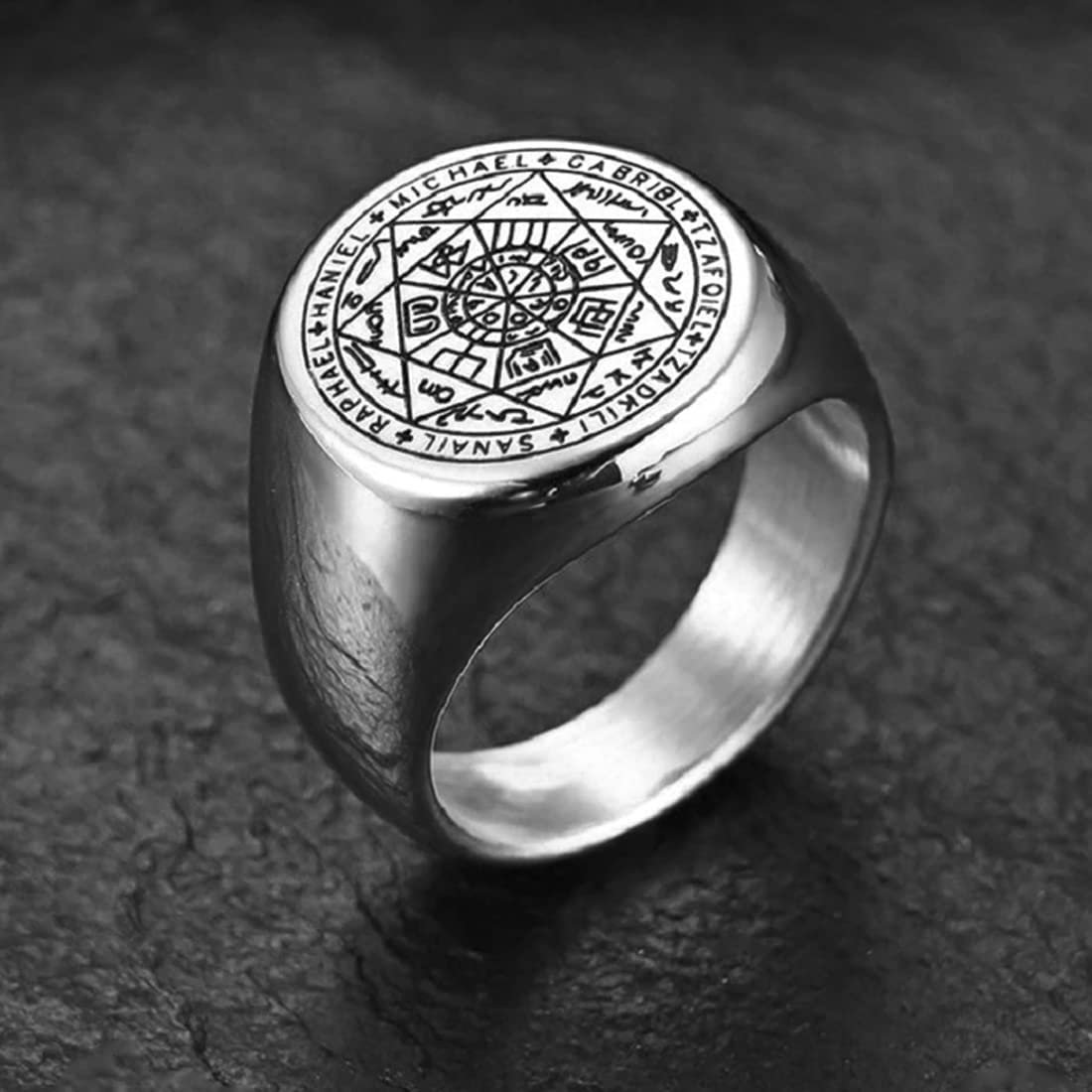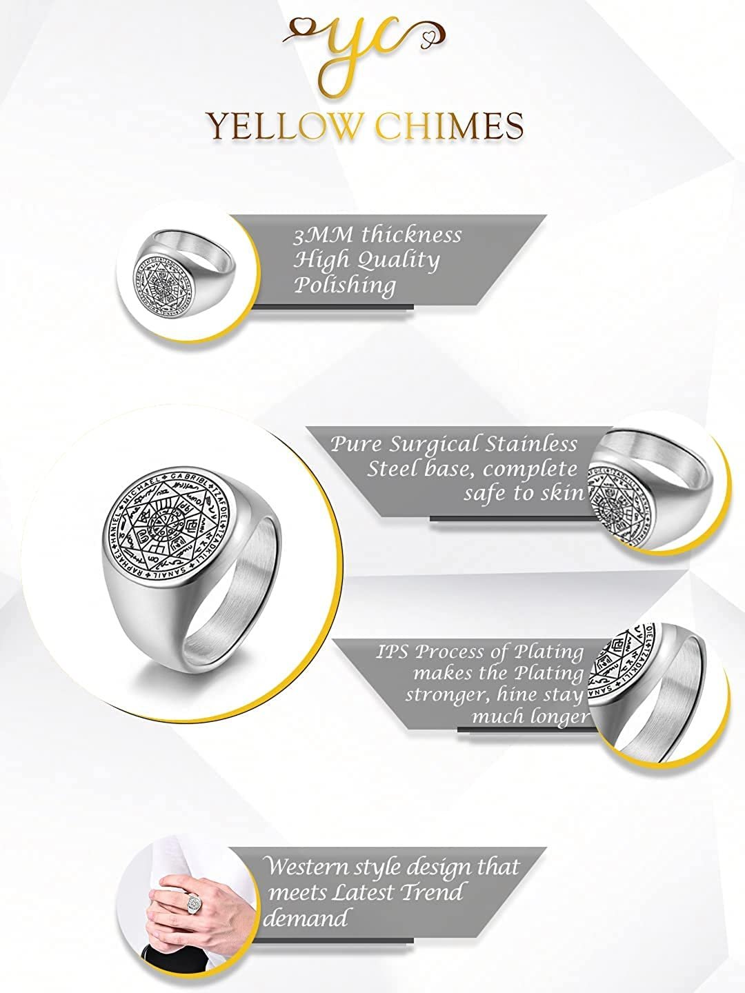 Yellow Chimes Rings for Men Stainless Steel Silver Ring The Seals of The Seven Archangels Protection Band Ring for Men and Boys.