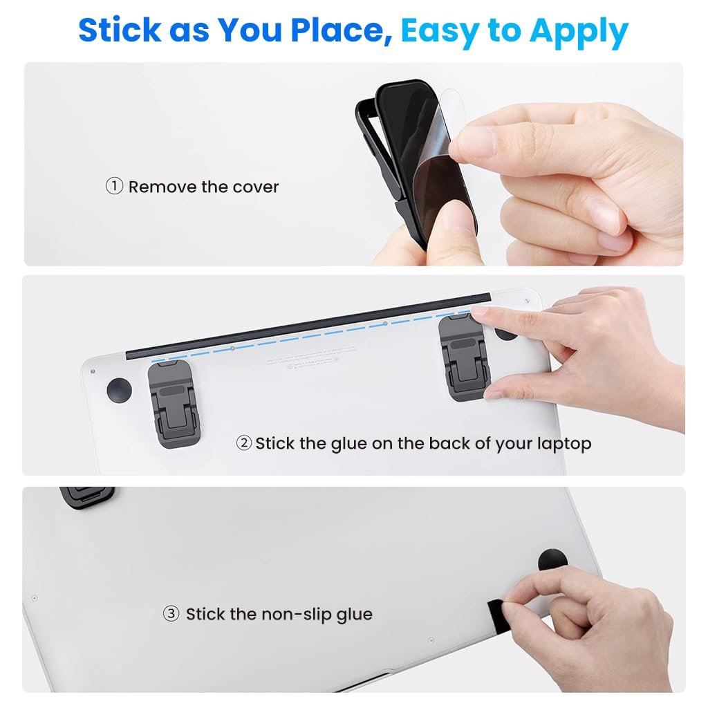ADHESIVE FOLDING LAPTOP RISERS FOR EASY PORTABILITY: The laptop risers feature a convenient self-adhesive folding mechanism, allowing you to keep them attached to your laptop for instant use. Their lightweight and compact design make them ideal for on-the-go professionals, ensuring ergonomic comfort anytime, anywhere without compromising your device’s sleek look.