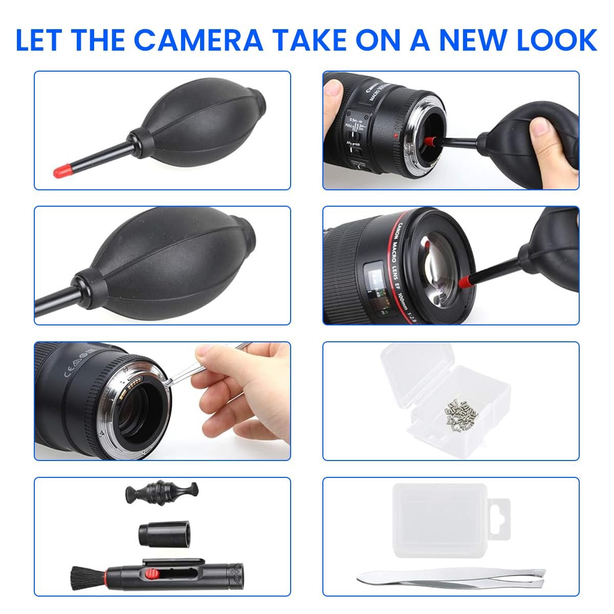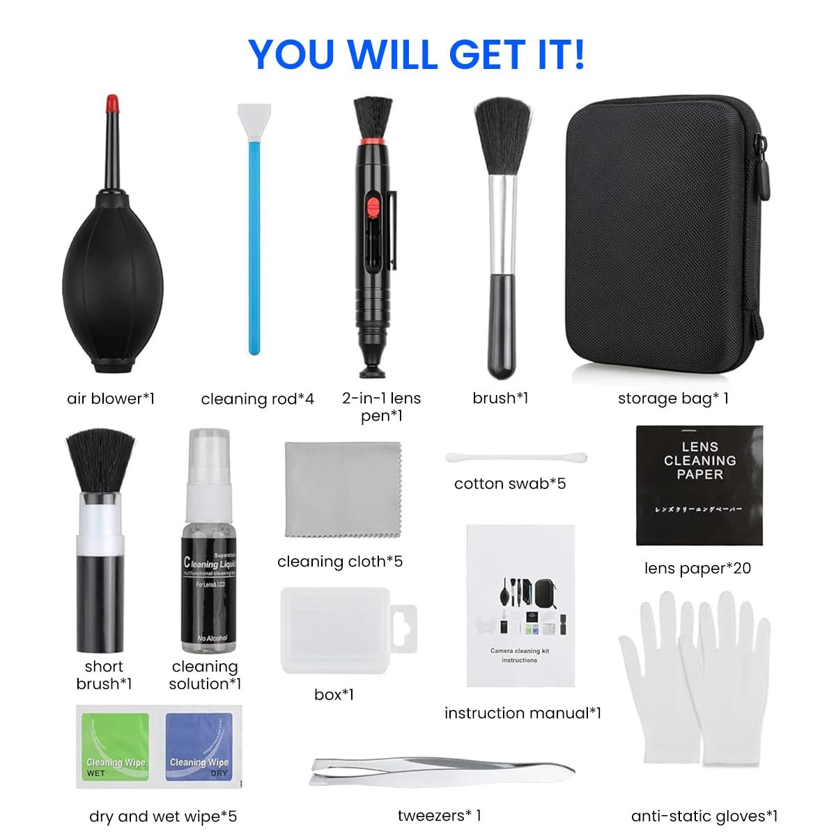 COMPREHENSIVE CLEANING TOOLS: Packed with a wide array of tools, this camera Lens cleaning kit includes air blower * 1, keyboard cleaning brush * 1, lens cleaning pen * 1, ccd swab * 4, storage bag * 1, cleaning solution * 1, storage box * 1, cleaning cotton swabs * 6, tweezers * 1 lens paper * 1, cleaning cloth * 1, dry wet depart package * 5, glove * 1, dust removal cleaning brush * 1. They can promise you have right tools for each cleaning and maintanience for your treasured electronics.